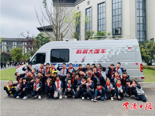 湖師大附屬德山學校同學在科普大篷車旁留影。