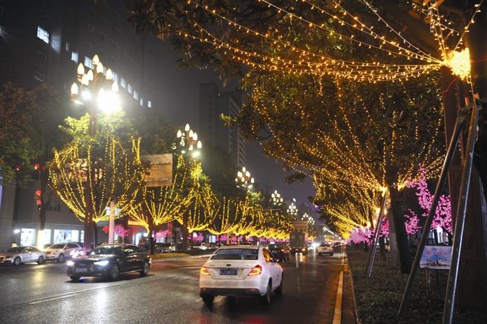 1月25日,年味漸濃,在市城區武陵大道,兩旁綠化帶的樹木被金色、桃紅色的燈帶裝點,更添喜慶氛圍。