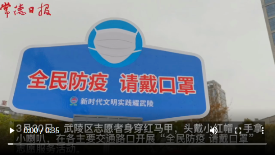 ????“科學(xué)規(guī)范佩戴口罩 ,注意加強(qiáng)個(gè)人防護(hù)……” 3月30日,市城區(qū)大小街巷都回蕩著“小喇叭”清脆的提醒聲。武陵區(qū)全體在家區(qū)級(jí)領(lǐng)導(dǎo)也身穿紅馬甲,頭戴小紅帽,手拿“小喇叭”以普通志愿者身份,在市城區(qū)各主要交通路口開展“全民防疫 請(qǐng)戴口罩”志愿服務(wù)活動(dòng)。