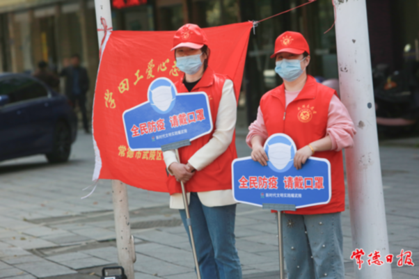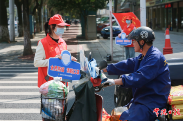 ????洞庭大道陽山大道交會處志愿者提醒市民佩戴口罩