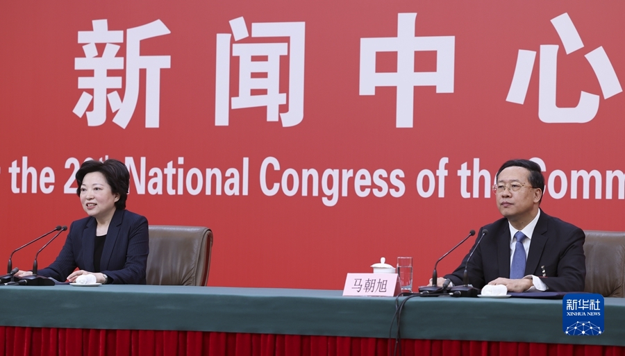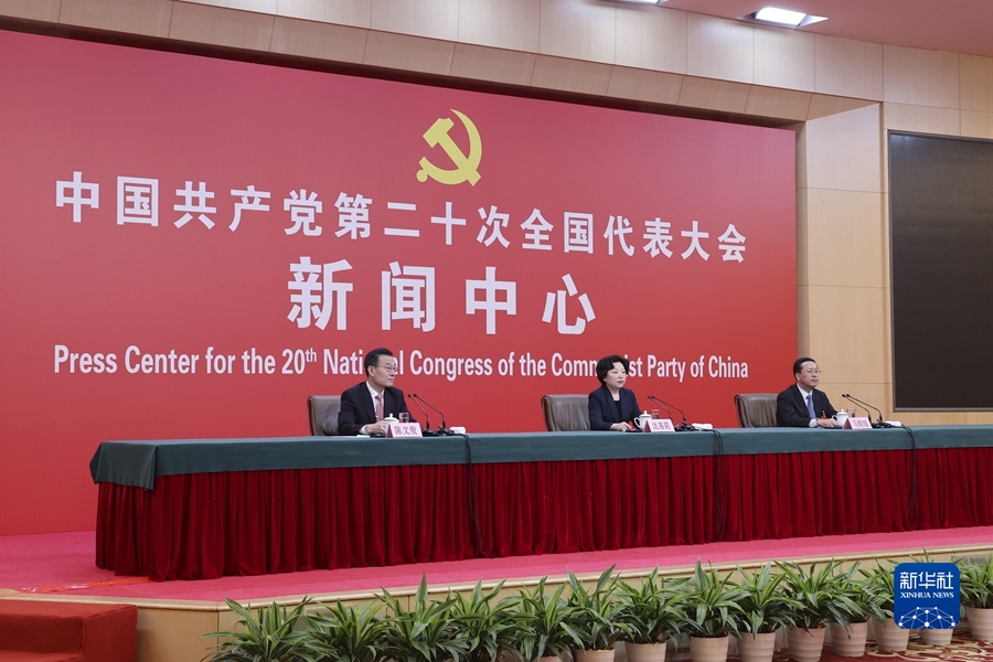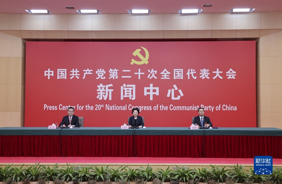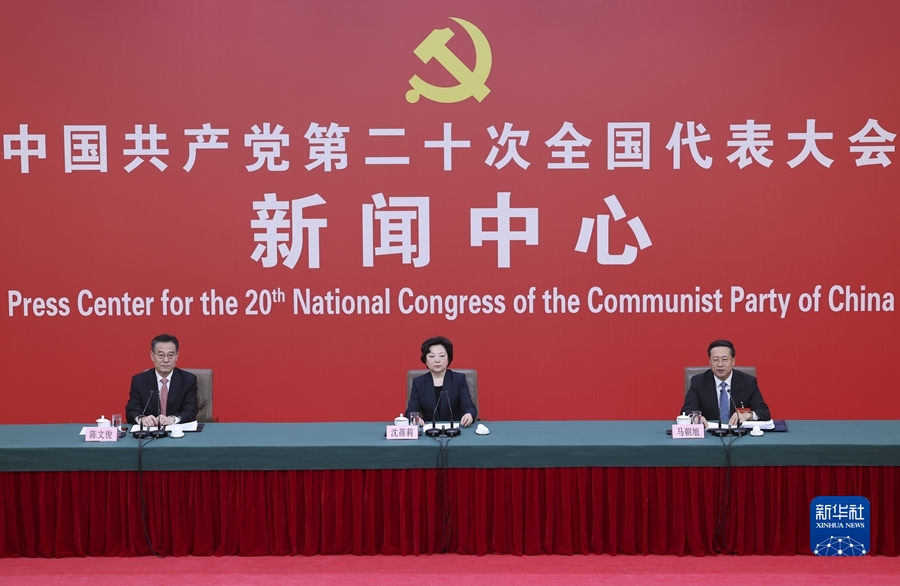 10月20日,中國共產黨第二十次全國代表大會新聞中心舉行記者招待會。中央對外聯絡部副部長沈蓓莉,外交部黨委委員、副部長馬朝旭圍繞“習近平外交思想指引中國特色大國外交開拓前行”主題與記者交流。新華社記者 陳建力 攝