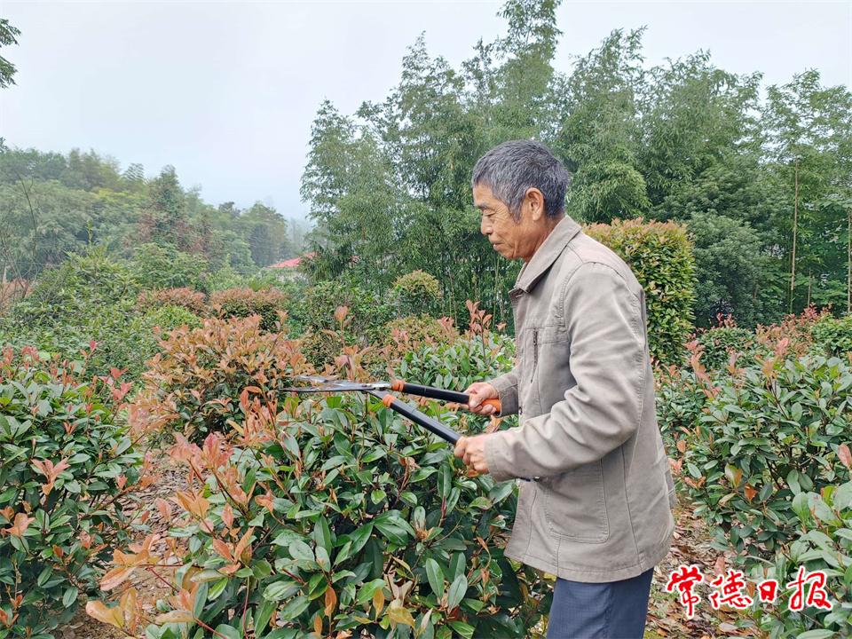 “這個紅檵木是圓柱形,那個羅漢松是孔雀形,紅葉石楠是圓球形,這些形狀都是根據市場的需求修剪的,哪種形狀值錢,我就慢慢琢磨,三年五年就成形了。有形狀的花木市場價格要高很多呢!”張開忠一邊修剪,一邊談他種植花木的體會。