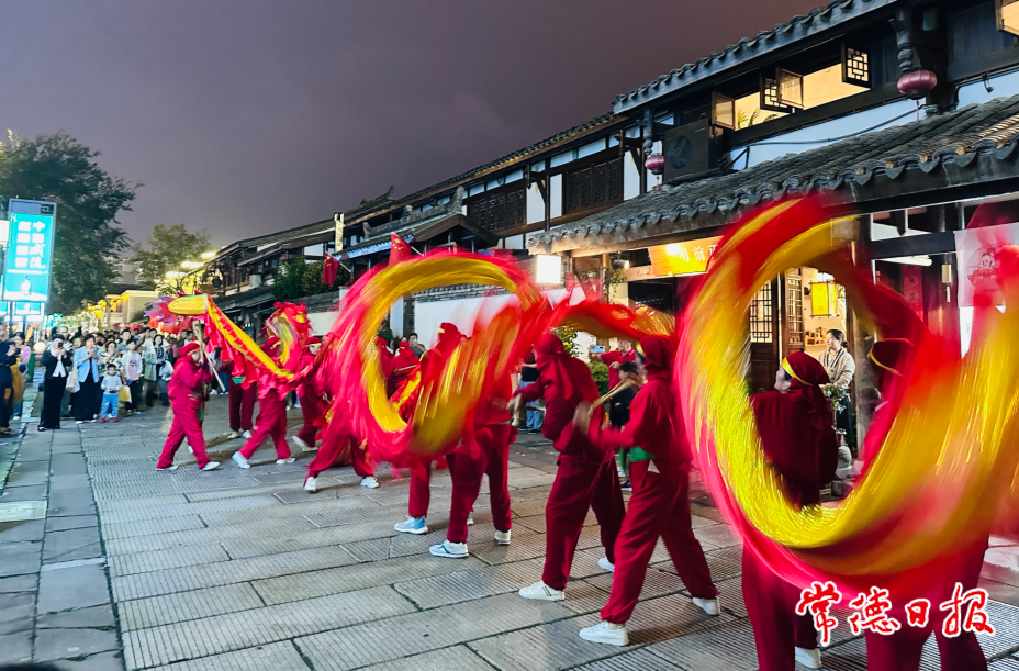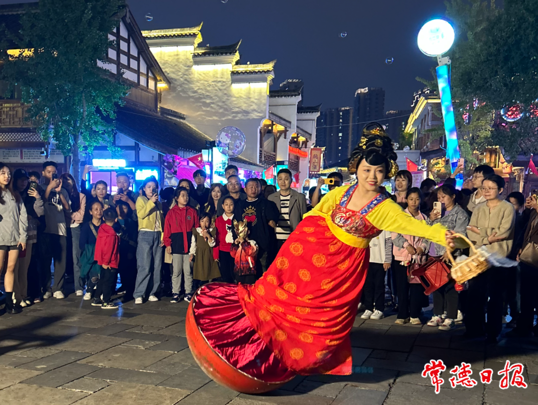 9月30日至10月5日期間,每天19時,常德絲弦、地花鼓、采蓮船、桃源板龍燈、舞龍舞獅等非遺項目便在常德河街接連上演,沉浸式的演出場景、精彩的非遺表演,吸引了眾多市民游客前來“打卡”拍照。大家一邊暢享街區(qū)內(nèi)的各色美食,一邊游覽觀演,盡情感受歡樂且充滿文化底蘊的常德夜生活。