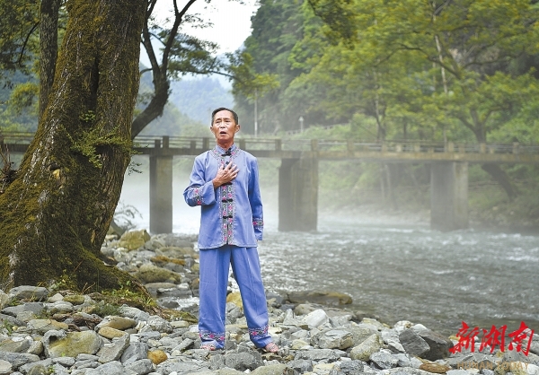 7月11日,桑植縣五道水鎮七眼泉附近,土家族民歌手袁紹榮唱起了山歌。