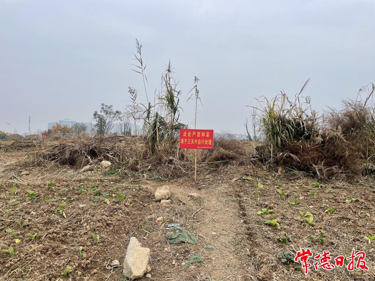 12月13日上午,又有市民向記者反映,近幾日雖有街道和社區的工作人員現場宣傳,但并未看到有居民主動清理自己的“菜園”。隨后,記者在現場看到,“菜園”里多處貼有“此處嚴禁種菜,請于三天內自行處理”的告示,落款為武陵區永安街道辦事處,但所種蔬菜仍未清理。記者經過再次與市自然資源和規劃局、市經投集團、武陵區區長熱線溝通,“菜園”的處理單位得到落實。12月16日,市經投集團調用設備,將風光帶儲備地塊上的“菜園”全部清除。