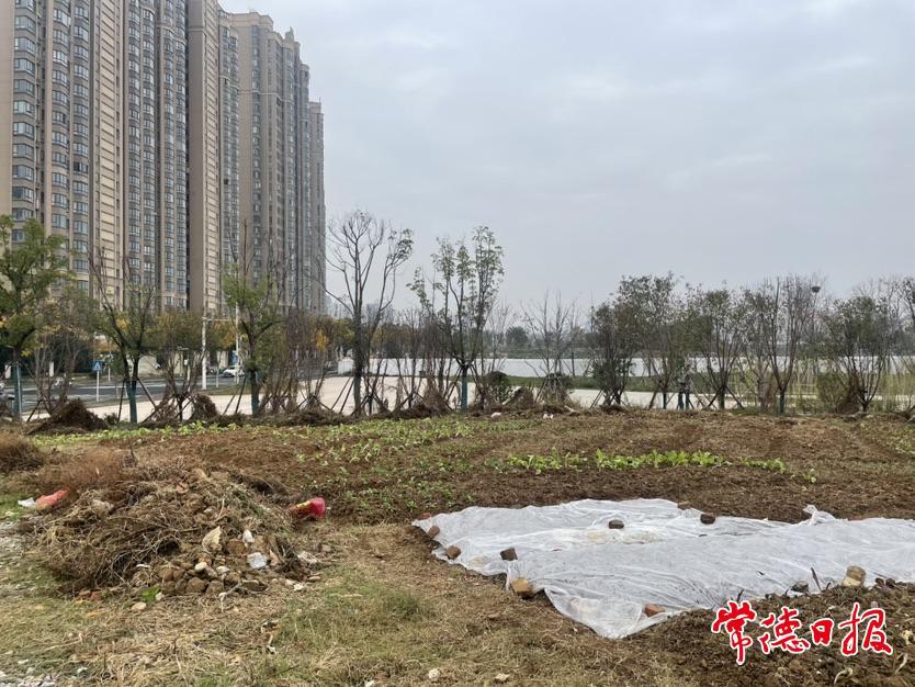 12月5日,記者發現有網友在常德論壇留言:紫月橋南岸附近的穿紫河風光帶出現了大面積“菜園”。記者立即趕到現場,發現確實有大片土地被開墾成“菜園”。“菜園”的邊緣與風光帶的草皮連在一起,里面種植著白菜、萵筍、大蒜等時令蔬菜,菜地周圍堆積著大量枯草、塑料桶、薄膜。