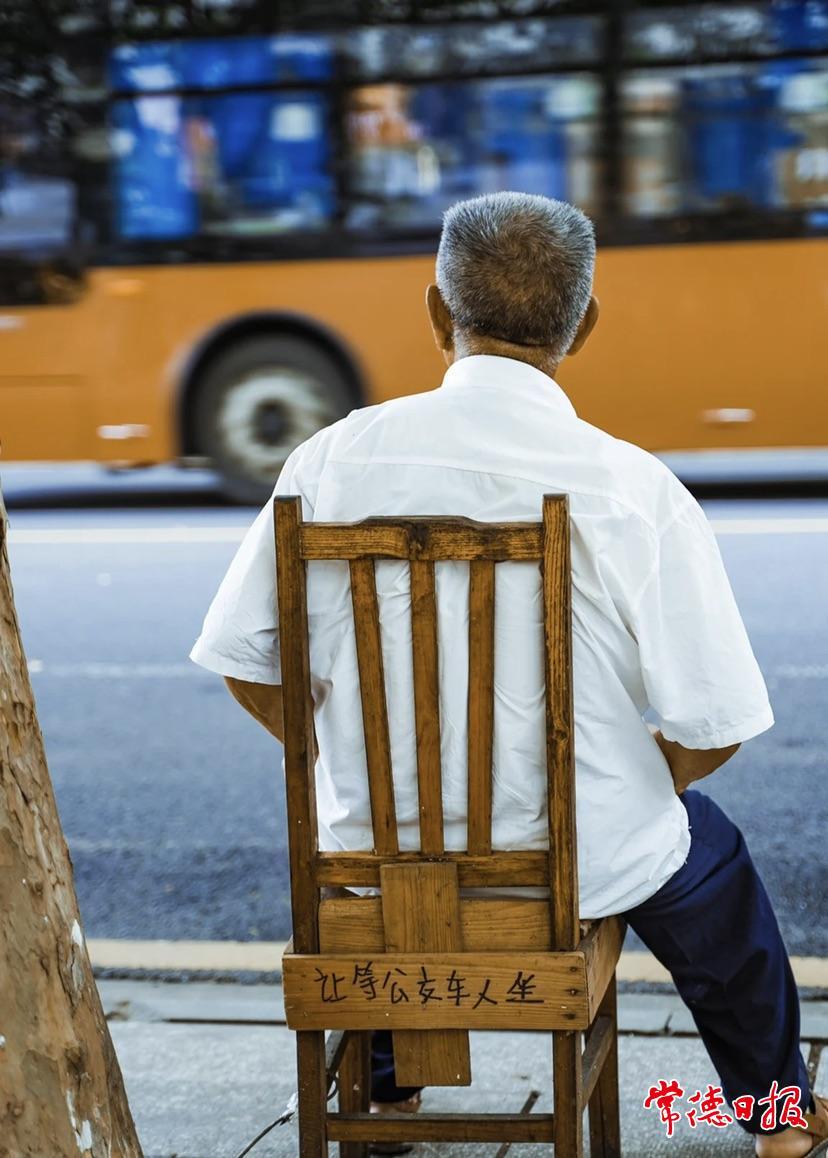 隨后,李軻拍攝的一組名為“活在三岔路”的街巷照片在社交媒體上走紅,吸引了3.8萬網友瀏覽。這組照片構圖簡潔明了,色彩真實自然。最后一張照片定格在夏日正午的公交站臺旁,一把明顯經過加固的舊靠背椅,椅背的一塊橫木板上用黑色簽字筆寫著“讓等公交車的人坐”,一位滿頭白發的老人坐在椅子上,望向公交車駛來的方向。