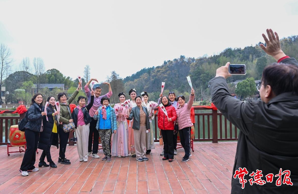 在桃花源,多株桃樹率先爭春,粉紅色的花蕾給景區(qū)帶來一抹亮色。桃林中,人面桃花相映紅,眾多女性游客紛紛拍照留念,記錄下這美好的瞬間。
