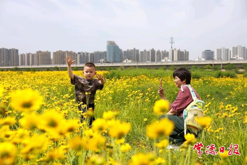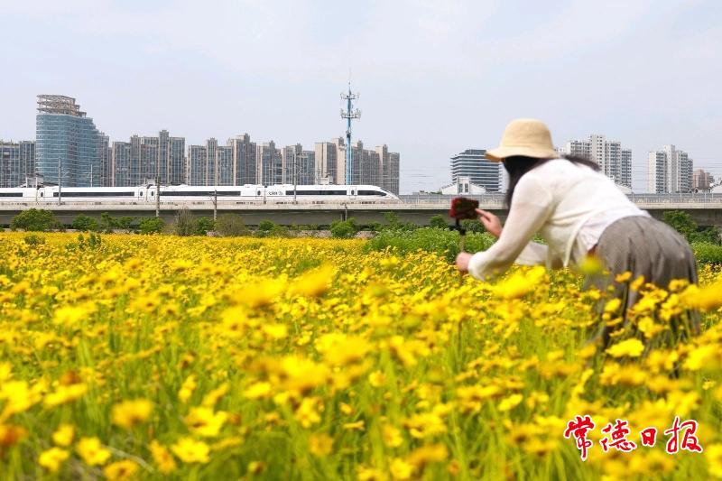 5月6日,在常德市城區太陽大道泰達潤景園小區對面,大片金雞菊燦爛綻放,金黃絢麗的景致美不勝收。呼嘯疾馳的高鐵,從這片“花?!遍g穿梭而過,引得眾多市民紛紛前來打卡,與高鐵同框。常德日報記者 蔡文龍 攝影報道