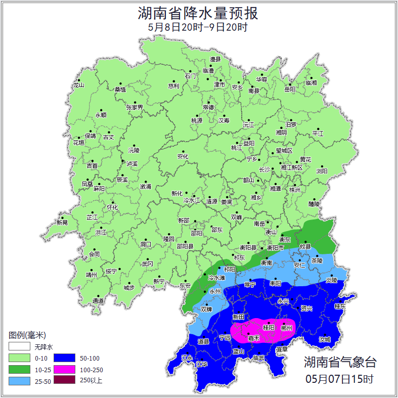 8日晚上至9日白天,湘東南陰天有大到暴雨,其中永州(新田、藍山、寧遠)、郴州(市區、桂陽、嘉禾、臨武、宜章)大暴雨,其他地區陣雨轉陰天;湘南南風轉北風2~3級,其他地區北風2~3級,雷雨時局地陣風8~10級;最高氣溫26~29℃;最低氣溫16~20℃。