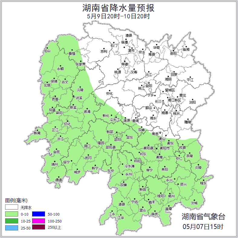 9日晚上至10日白天,湘西、湘南陰天有小雨,其他地區陰天間多云;北風3~4級;最高氣溫湘西23~25℃,其他地區25~29℃;最低氣溫16~20℃。