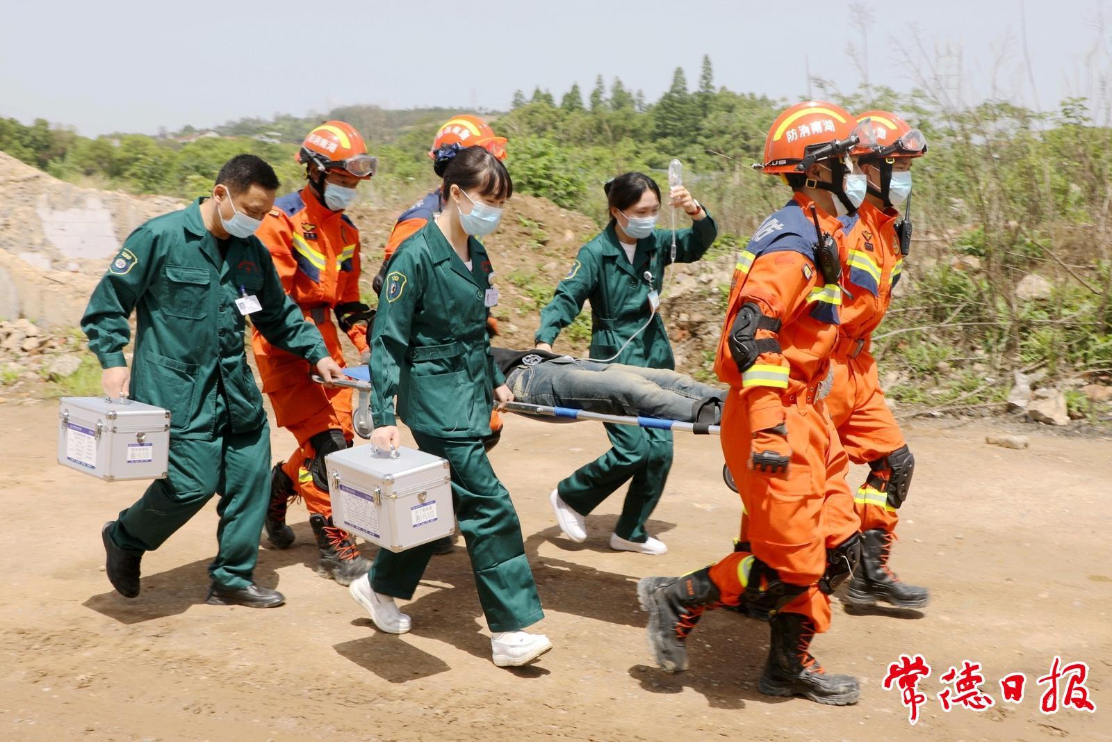 “報告,現(xiàn)場有居民頭部異物砸傷頭部外傷,請求醫(yī)療救援?!钡卣鹁仍菥毈F(xiàn)場,模擬當?shù)匾痪用裥^(qū)因地震導致建筑坍塌人員被困受傷。接到報告后,消防員、醫(yī)院創(chuàng)傷急救中心醫(yī)護救援隊成員立即展開創(chuàng)傷現(xiàn)場醫(yī)療救護,為“受傷”居民包扎傷口、抬著他翻越殘垣斷壁,緊急護送居民到120救護車。