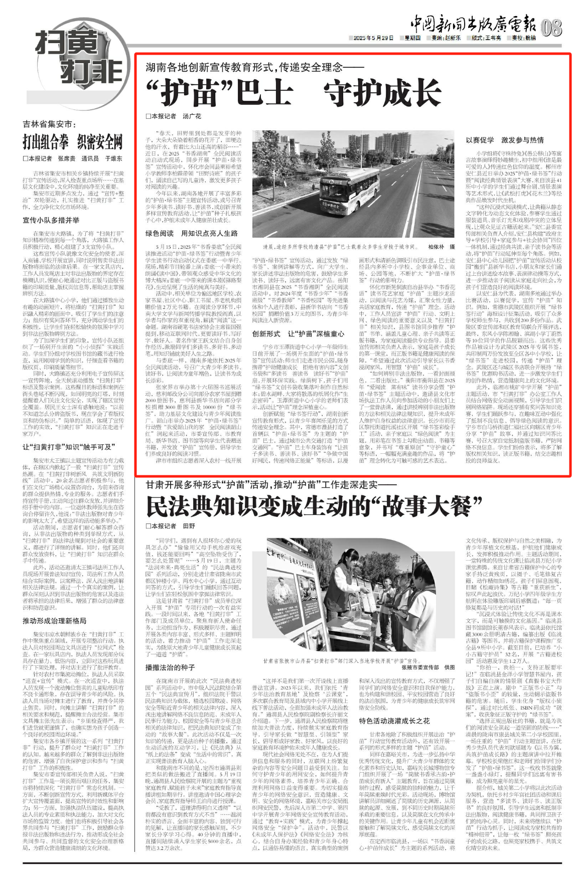 創新賦能“綠書簽行動”,湖南創新宣傳教育形式,以青少年喜聞樂見的方式傳遞安全理念。其中,常德市澧縣打造了首輛以“護苗·綠書簽”為主題的“護苗”巴士,通過城市公共交通打造“護苗交通網”。“護苗”巴士車身裝飾有“讓孩子多讀書、善讀書、讀好書”“爭做中國好網民,傳遞網絡正能量”等標語,以漫畫形式和清新色調吸引市民注意,巴士途經縣內多所中小學校、企事業單位、商場、公園等地,不斷擴大“護苗·綠書簽”行動的影響力。