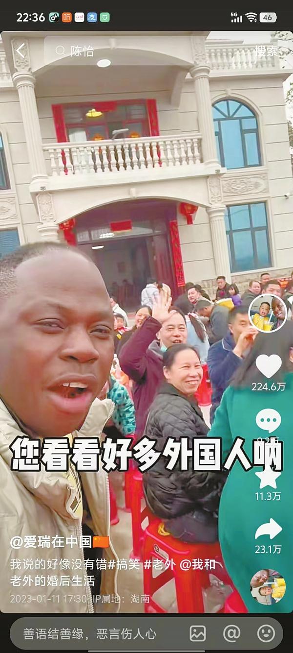 “我很喜歡農村,生活很有味,人很有趣。”坐在農家院子里,穿著中山裝的愛瑞與記者分享他的感受。后來,他又拍攝了“非洲老外和娭毑(湖南方言:奶奶)斗嘴”“吃農村宴席,被熱情的村民加飯”等視頻,受到廣大網友喜愛。