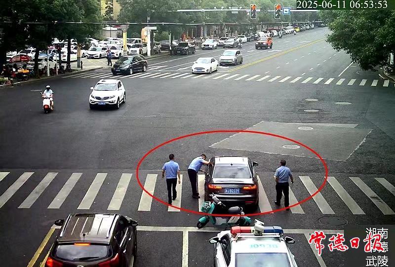 常德日報記者 王敏 通訊員 劉小滿 蘇瑩 文/圖 近日,市城區芙蓉路與竹葉路交會處,一輛黑色小車停在斑馬線上一動不動,路口車輛紛紛繞行,著實危險。好心市民群眾從附近推來一輛共享單車設置臨時路障,并撥打110報警。