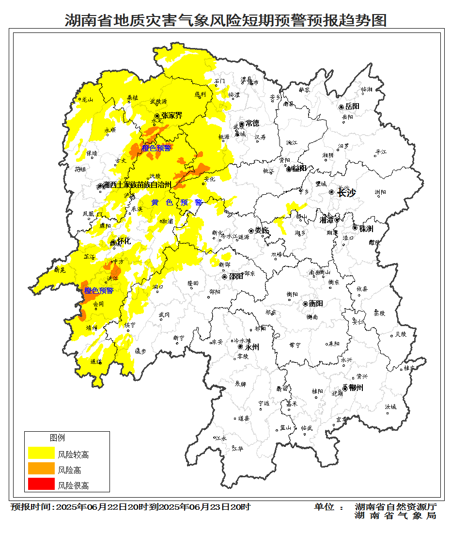根據地質災害成災規律和孕災條件,結合2025年6月22日短期氣象預報情況,省自然資源廳與省氣象局聯合會商得出如下結論:自6月22日20:00至23日20:00,受降雨影響,湘西的常德、張家界、益陽、懷化、湘西土家族苗族自治州等市州部分山地丘陵區發生突發性地質災害風險高橙色預警,湘中、湘西的長沙、湘潭、邵陽、常德、張家界、益陽、懷化、婁底、湘西土家族苗族自治州等市州山地丘陵區發生突發性地質災害風險較高黃色預警。