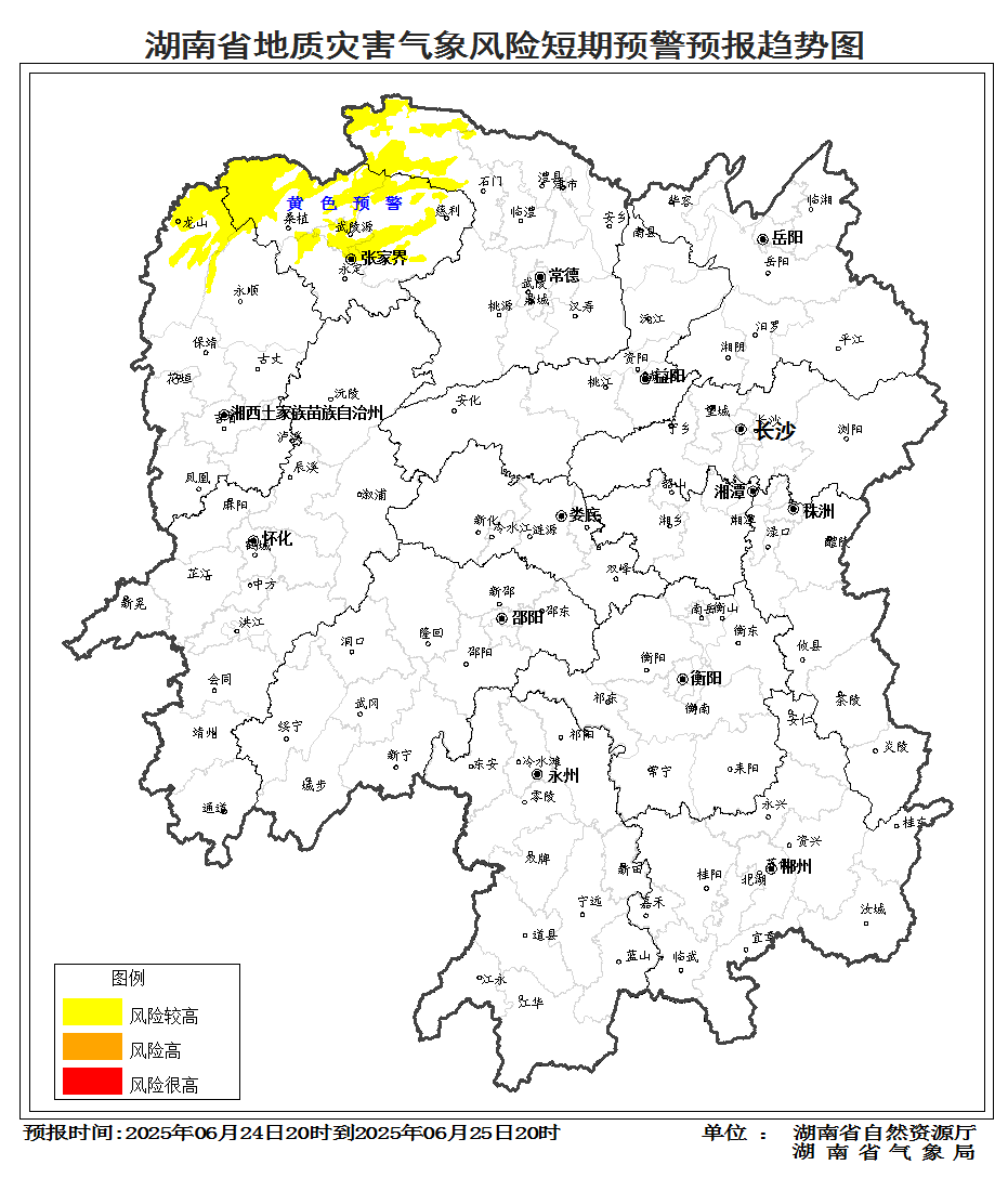 根據地質災害成災規律和孕災條件,結合2025年6月24日短期氣象預報情況,省自然資源廳與省氣象局聯合會商得出如下結論:自6月24日20:00至25日20:00,受降雨影響,湘西北的常德、張家界、湘西土家族苗族自治州等市州山地丘陵區發生突發性地質災害風險較高黃色預警。