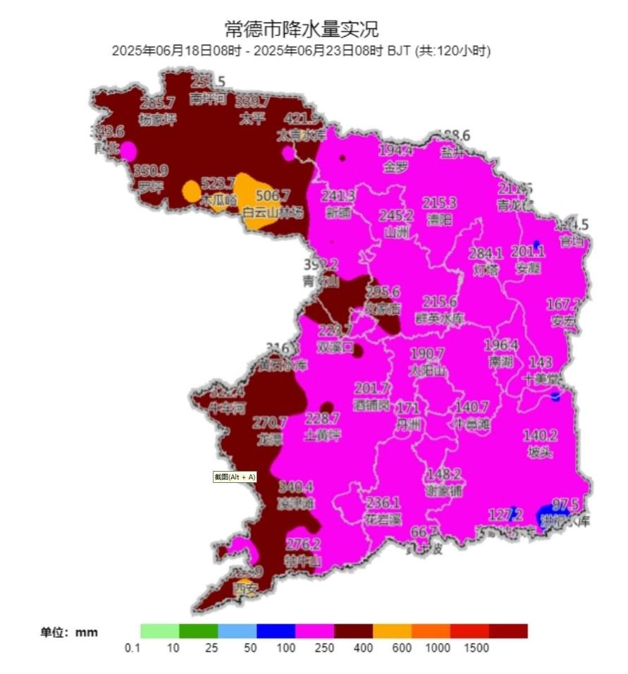 6月18日8時至23日8時,全市面雨量204.4mm,累計(jì)最大為石門縣316.5mm,其次為桃源縣244.5mm。石門1小時、3小時、6小時、12小時、24小時和澧縣12小時降水量均突破當(dāng)?shù)貧v史極值。
