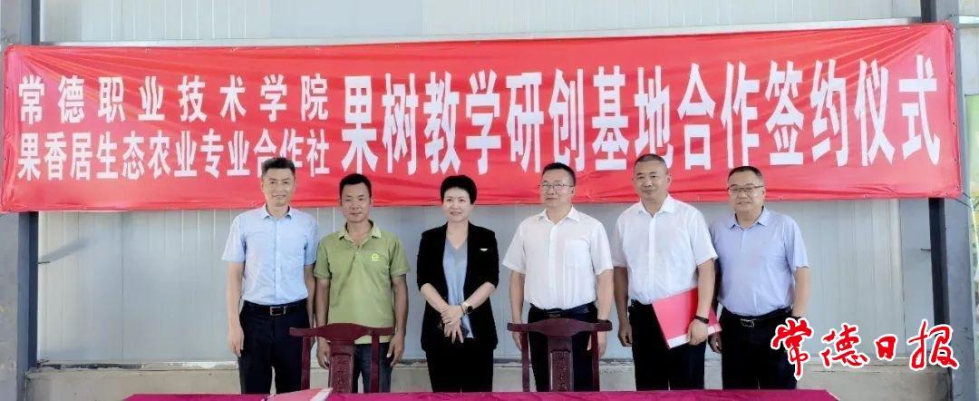 常德日報記者 肖芳影 通訊員 王木子 文/圖 7月3日,常德職業(yè)技術(shù)學(xué)院與果香居生態(tài)農(nóng)業(yè)科技農(nóng)民專業(yè)合作社在柳葉湖旅游管理區(qū)白鶴鎮(zhèn)白鶴山社區(qū)舉行基地項目簽約暨教學(xué)研創(chuàng)基地揭牌儀式。