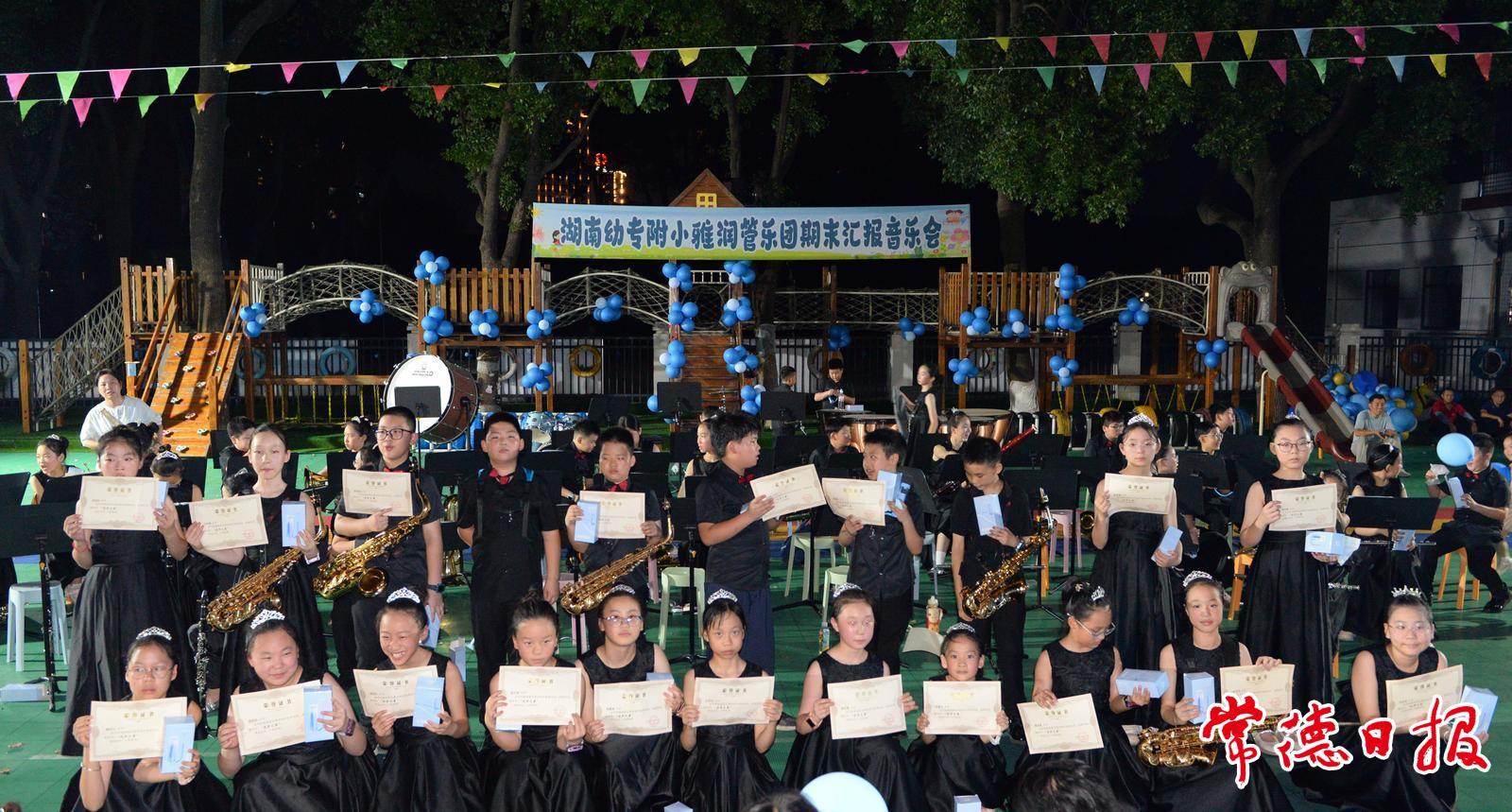 常德日報記者 徐珊珊 攝 7月5日,湖南幼專附小雅潤管樂團2025年上學期期末匯報音樂會在學校和美廣場舉行,學校管樂團一、二團的小樂手和家長參加了此次活動。音樂會以演奏+現場講解的形式進行,隊員們現場演奏了多首中外作品,老師們講解了樂團聲響訓練、管樂演奏法等方面的要求和處理方式。