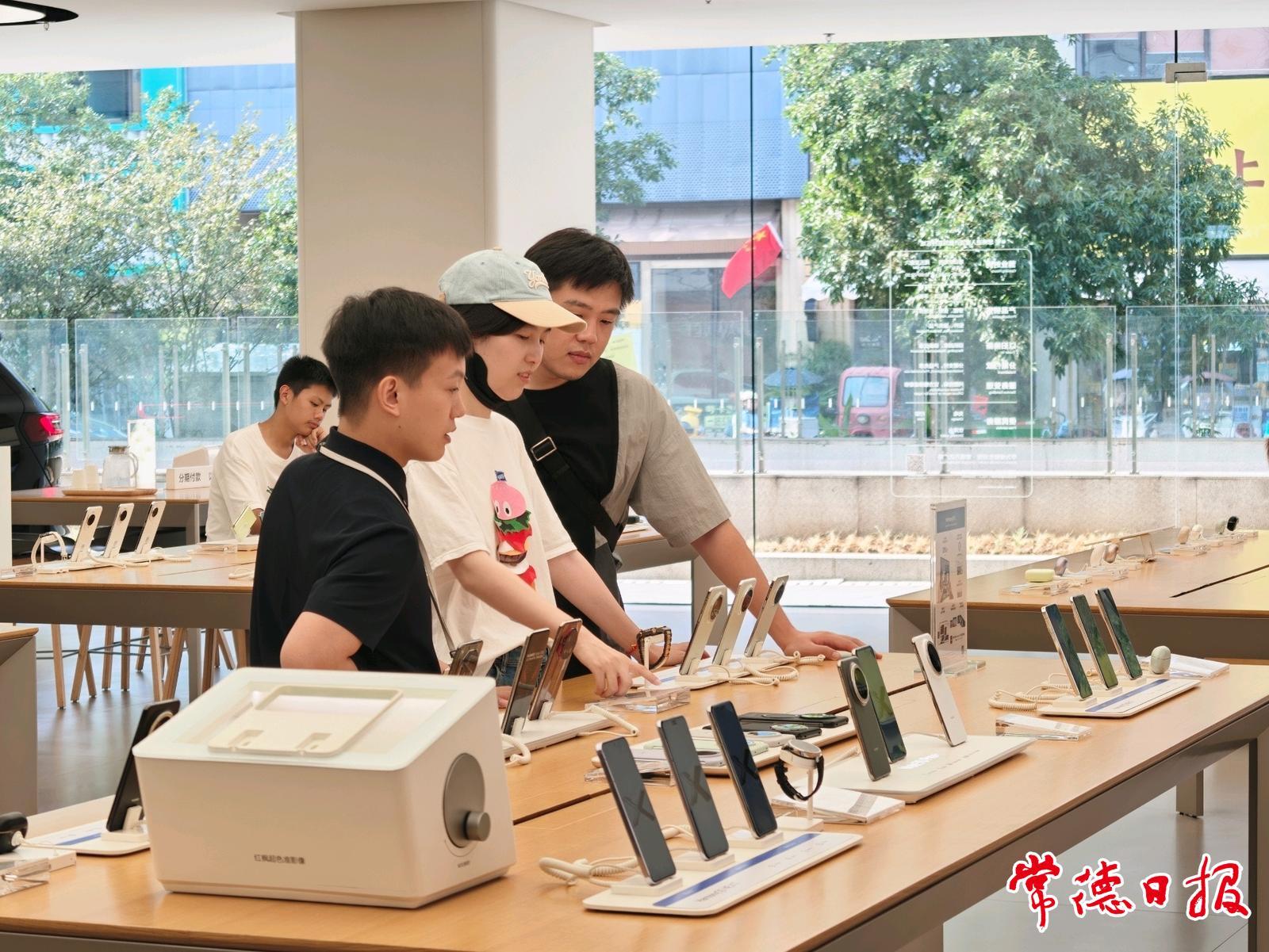 在常德萬達廣場各手機品牌體驗店內,手機銷售區域格外熱鬧。不少市民,特別是即將步入大學的高中畢業生,正在仔細挑選心儀的智能手機、電腦等電子產品。導購人員穿梭忙碌,熱情地向顧客介紹產品性能和當前的優惠活動。