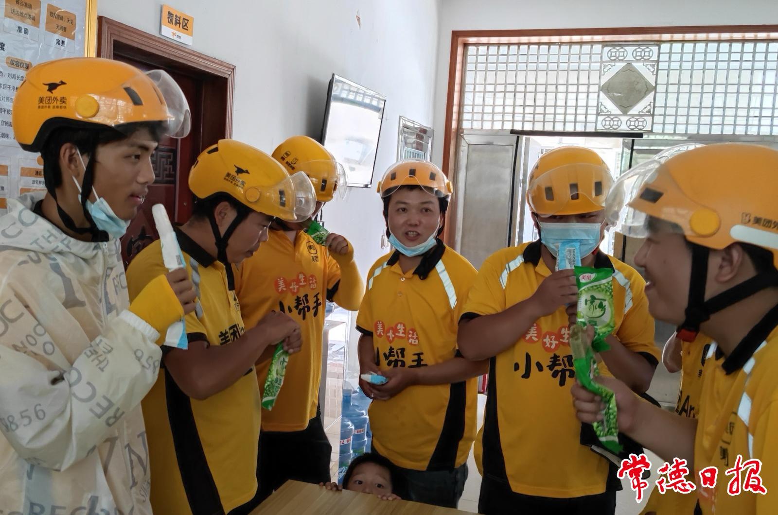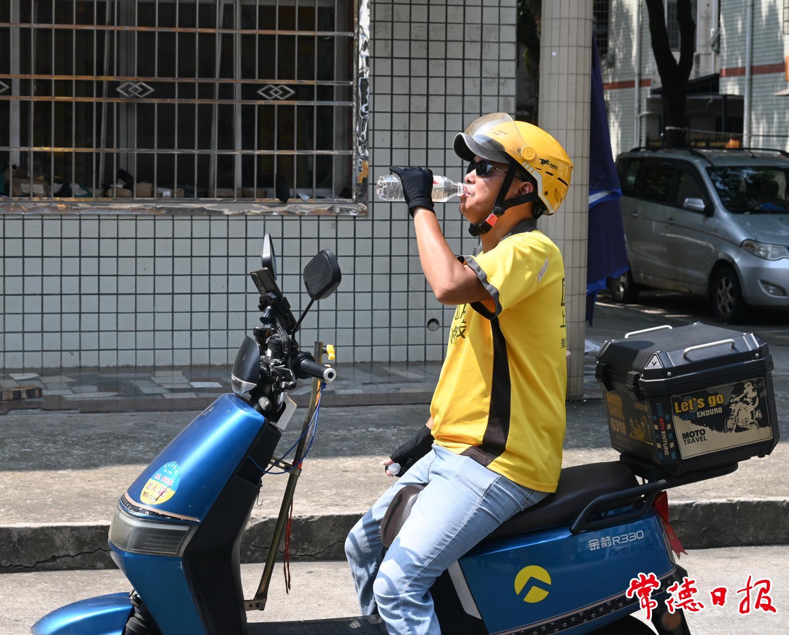 “天氣熱,客戶也體諒我們的不容易,經常‘投喂’我們?!倍∵M明告訴記者,上周送冰咖啡到寫字樓,客人給他塞了盒冰鎮綠豆沙;前天爬6層樓送西瓜,住戶追出來遞了冰棒。