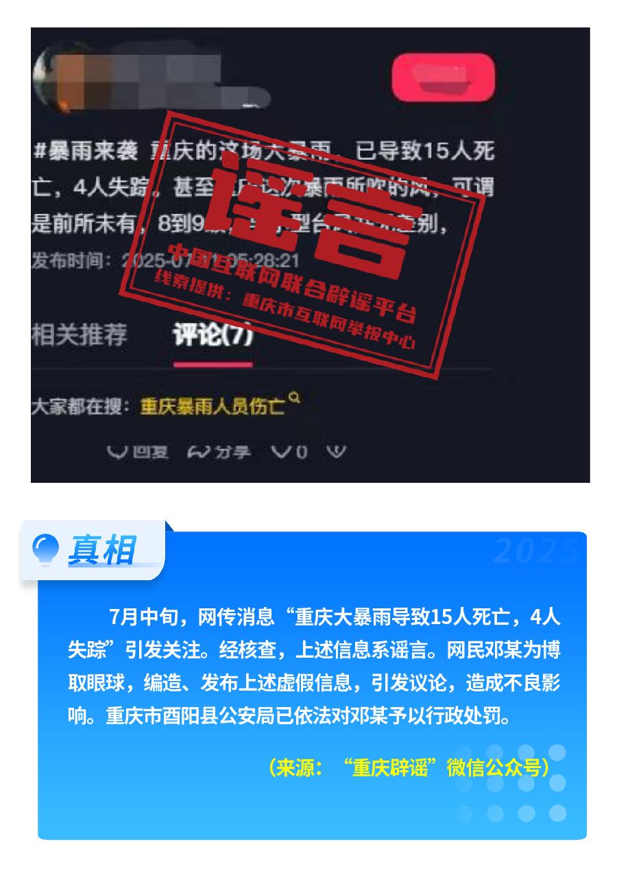 近期,網(wǎng)上接連出現(xiàn)發(fā)布虛假“警情通報”的惡性造謠傳謠案件,炮制傳播“昆明駕車撞人案131人死亡”“杭州自來水接入糞水”及涉釋永信虛假“警情通報”,模仿“藍底白字”格式,杜撰聳人聽聞細節(jié),損害政府公信力,嚴重擾亂社會秩序。“院士預(yù)測廣東將發(fā)生8級以上大地震”公然偽造專家聊天截圖,謊報地震預(yù)警。還有造謠者借盛夏高溫酷暑與洪澇災(zāi)害,編造“安徽淮北、山東泰安等地多人因高溫死亡” “重慶大暴雨導(dǎo)致15人死亡、4人失蹤”等謠言,蹭炒熱點、煽動情緒。