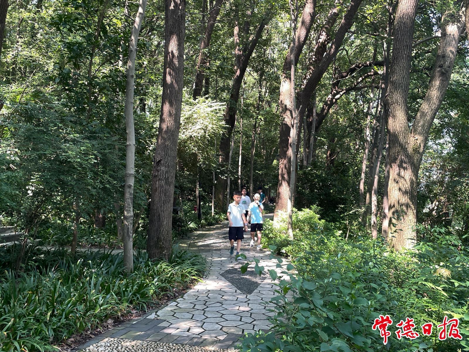 8月6日,行走在常德河洑山的林蔭道上,體感溫度比市中心城區低了不少,濃密的大樹遮擋了熾烈的陽光,枝葉間傳來或遠或近的鳥鳴和蟬鳴,因天熱而煩悶的心立即安靜下來。那些與我們擦肩而過的人們,那些時常往來于此的人們,是否知道這清幽靜謐的公園80多年前曾經槍林彈雨、血肉橫飛?美女峰地堡靜臥在綠樹之下、青草之間,地堡上銘刻的文字其實是一段慘烈的歷史。