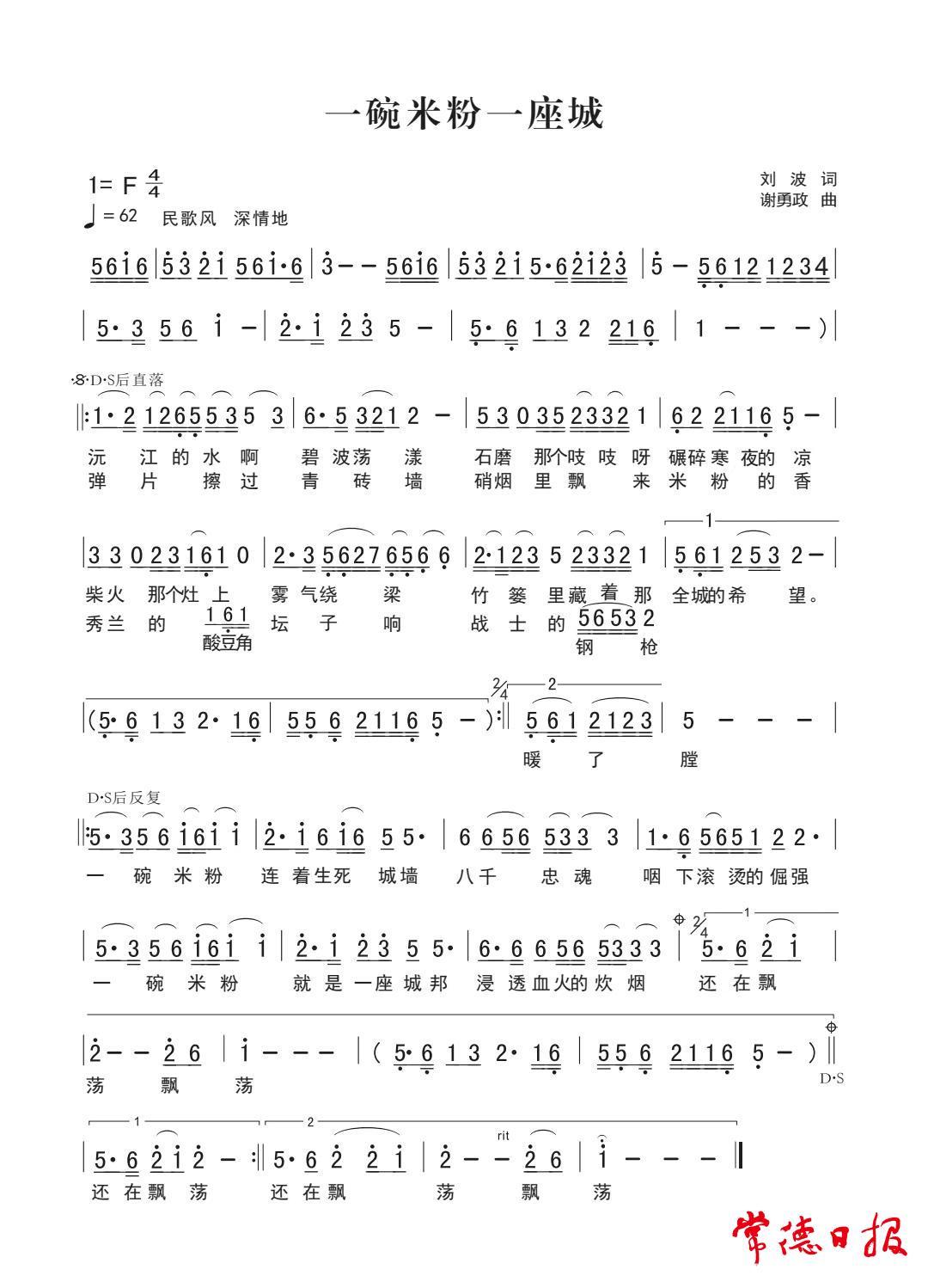 “他的詞很有感染力,我譜的曲一定要與詞的意境吻合。這首歌曲的旋律既要優(yōu)美深情,又要具有悲壯色彩。”“我的音樂動(dòng)機(jī)源于常德地花鼓這種本土民間小調(diào),但做了一些變化處理。”一個(gè)多月時(shí)間里,經(jīng)反復(fù)斟酌,幾易其稿,謝勇政完成《一碗米粉一座城》的譜曲。