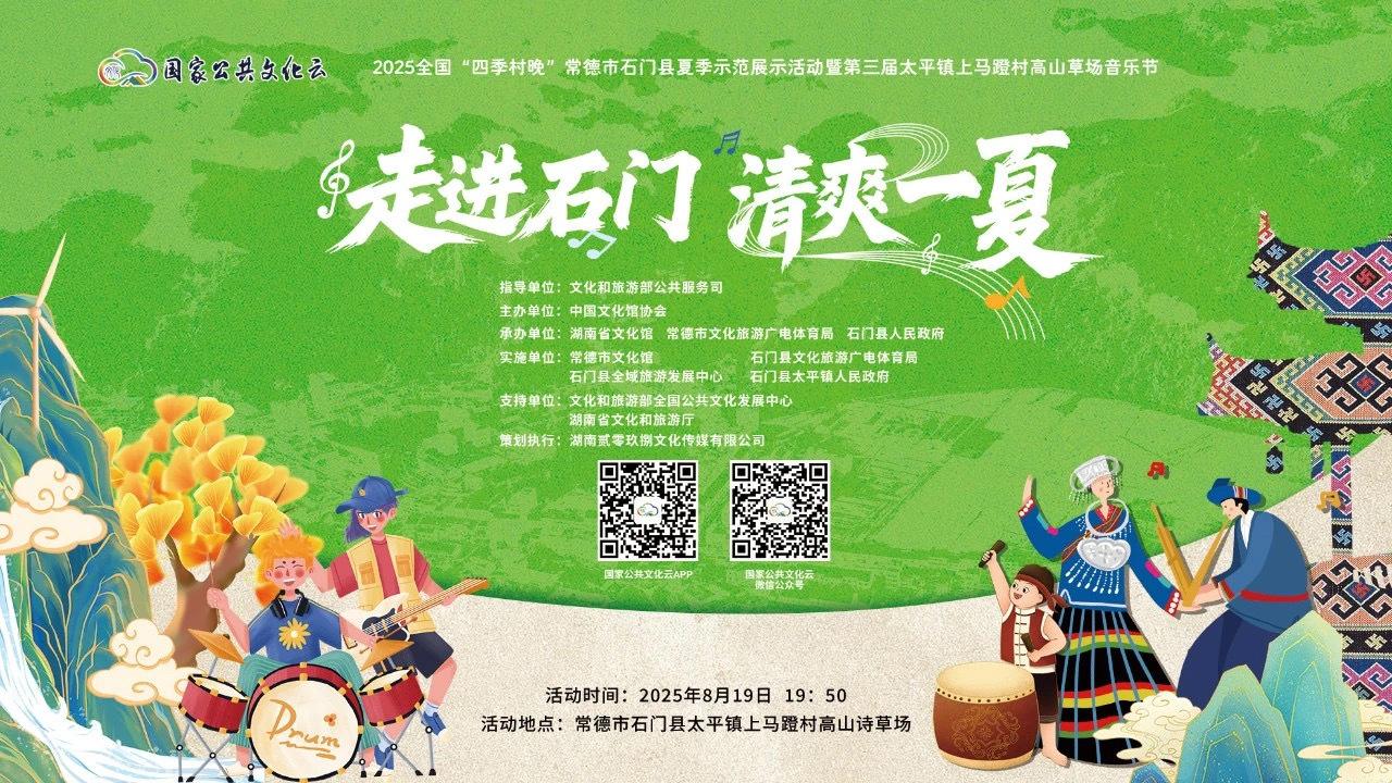 常德日報記者 楊鑫 通訊員 劉禮德 8月18日,記者從常德市文化館獲悉,“走進石門 清爽一夏”2025年全國“四季村晚”常德市石門縣夏季示范展示活動暨第三屆太平鎮上馬蹬村高山草場音樂節,將于8月19日19時50分在石門縣太平鎮上馬蹬村舉行。屆時,國家公共文化云將全程直播。