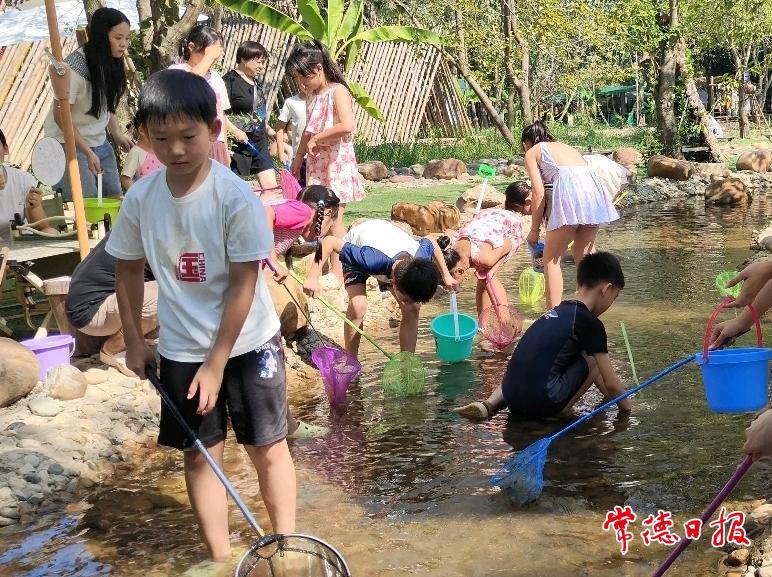 淺水區(qū)里,孩子們擼起袖子、提著小網(wǎng)兜,專注地盯著水中游動的泥鰍?!白サ嚼玻 鼻宕嗟臍g呼聲不時響起,孩子們小手攥著裝有泥鰍的玻璃瓶,臉上滿是雀躍。亮黃色的鴨子小船上,他們有的握著船槳輕輕晃動,看到魚兒游過,直接棄船摸魚,歡笑聲隨著水波擴散。