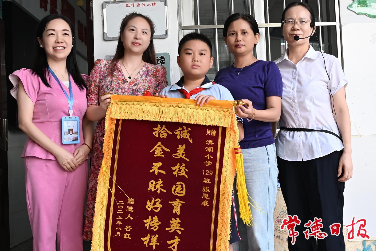 常德日報記者 姚璇 文/圖 8月31日,武陵區濱湖小學開學報到日,校園內氣氛熱烈。一位手持錦旗的市民站在校門口,引來眾多師生和家長的目光。她此行是專程感謝該校129班學生張恩豪拾金不昧的行為。