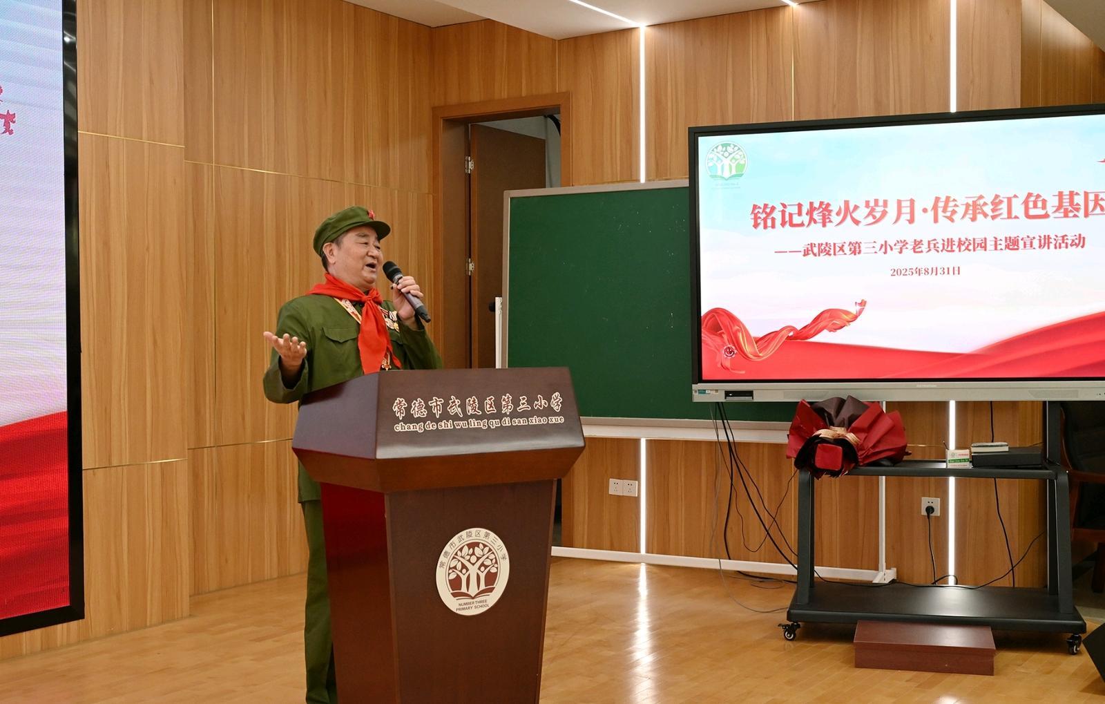 常德日報記者 張瑜 8月31日,新學期伊始,常德市武陵區第三小學以一場別開生面的“開學第一課”迎接新學期的到來。在對越自衛反擊戰中榮立一等功的老兵吳世忠受邀走進校園,以親身經歷為廣大師生上了一堂深刻的愛國主義教育課。