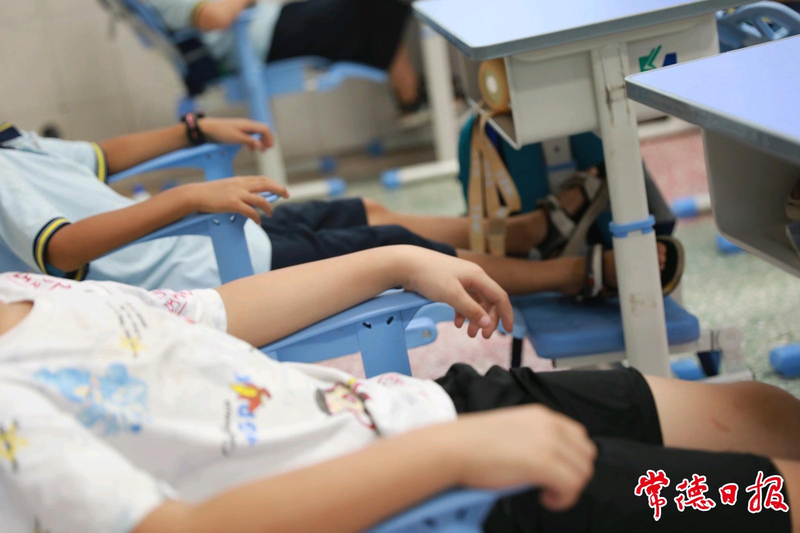 常德日?qǐng)?bào)記者 江一舟/文 李龍/圖 “這個(gè)午休課桌椅好好用呀!我自己動(dòng)手就能調(diào)整好?!?月2日中午,武陵區(qū)丹洲鄉(xiāng)中心小學(xué)二年級(jí)108班教室內(nèi),同學(xué)們?nèi)齼蓛苫氐阶?,熟練地把書本塞進(jìn)書包,接著握住課桌椅側(cè)邊的調(diào)節(jié)桿輕輕一扳,原本豎直的椅背緩緩向后傾斜,大家順勢(shì)躺靠在椅背上,老師貼心地關(guān)掉教室內(nèi)的燈光,整個(gè)班級(jí)瞬間進(jìn)入安靜的“躺睡”模式。