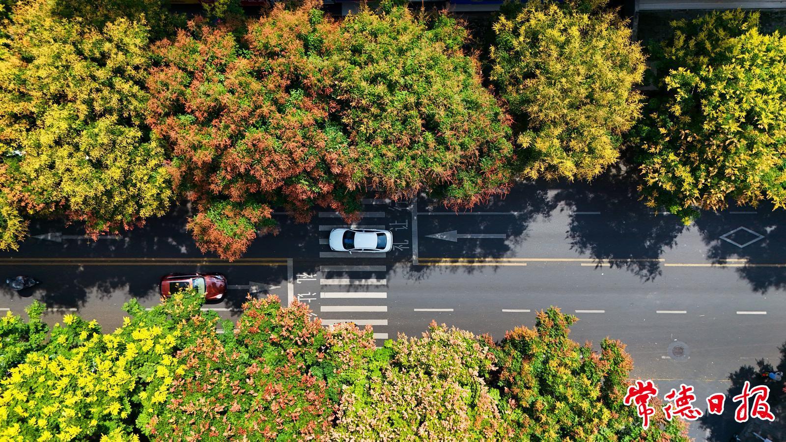 誰能想到,進入秋天,常德的街頭就像打翻了調色盤,嫩黃、淺紅、深紅先是輪番登場,然后同臺演出,街頭巷尾也從明亮瞬間變成斑斕,如同在藍天白云下展開了一幅幅畫卷。