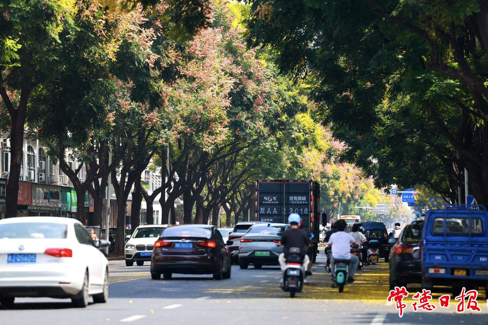 市城區水星·香榭里住宅小區的大門兩側,欒樹的枝頭異常熱烈,綠是沉靜的,黃是明凈的,粉是明媚的,紅是奔放的,每棵欒樹的樹梢都像一個舞臺。從小區里走出來的居民,立即就被這種熱烈粘住目光。小區對面的公交站臺上,幾位等車的市民都舉著手機拍照。這是9月12日下午,記者在常德市城區青年路上看到的場景。這些照片很可能會在當天或者幾日后,出現在微信朋友圈及其他社交平臺。幾周前,微信網友“宇文川穹”就發了龍港路的欒樹視頻,好似綠色的枝頭停滿了黃色的飛鳥。沒幾天,網友“檀木先生”的美圖又亮相朋友圈,嫩黃與深紅襯著碧藍的天空,明亮干凈,一如壁紙,配文亦與照片輝映:一棵欒樹開花有先后,有些已結出嫩果,更多的花卻正接連綻放——一邊是落花滿地,一邊是繁花滿樹。它們就這樣層層疊疊,黃的花、紅的果、綠的葉,交織出繽紛的層次,把整個初秋渲染得明亮而熱烈。