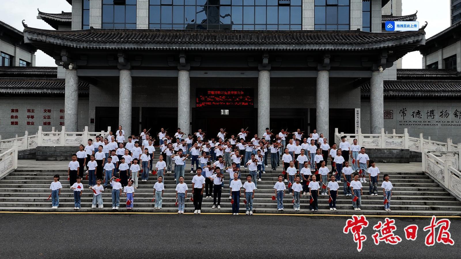 常德日報記者 姚璇 文/圖 9月27日上午8時許,常德博物館前坪響起《紅星閃閃》的熟悉旋律,一場由百余名青少年參與的迎國慶“快閃”活動在此舉行。參與此次活動的少年來自常德啟明星小提琴鋼琴藝術學校、呱呱聲樂學校及武陵合唱團。他們用清澈的歌聲、嫻熟的小提琴演奏技巧和飽滿的熱情,吸引了清晨往來市民的目光,也為即將到來的國慶節增添了青春的亮色。
