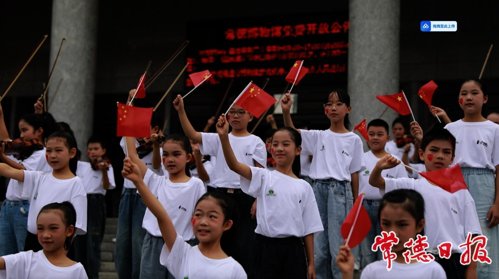 “站在常德這片沃土,讓歷史的回響與時代的強音,共同譜寫成禮贊祖國的圣歌。”隨著常德博物館講解員話音落下,幾名領唱員清亮的嗓音率先劃破周末清晨的寧靜,“紅星閃閃,放光彩……”熟悉的旋律瞬間點燃現場氛圍。緊接的是悠揚的小提琴聲合奏,以及百余名少年兒童齊聲高歌。他們精神抖擻,手中揮舞著鮮艷的旗幟,稚嫩而有力的合唱聲在博物館廣場上空回蕩。不少晨練或路過的市民紛紛駐足,有的舉起手機記錄下這意外而動人的一幕,有的則情不自禁地跟著旋律輕聲附和。