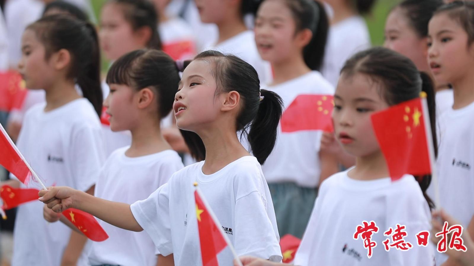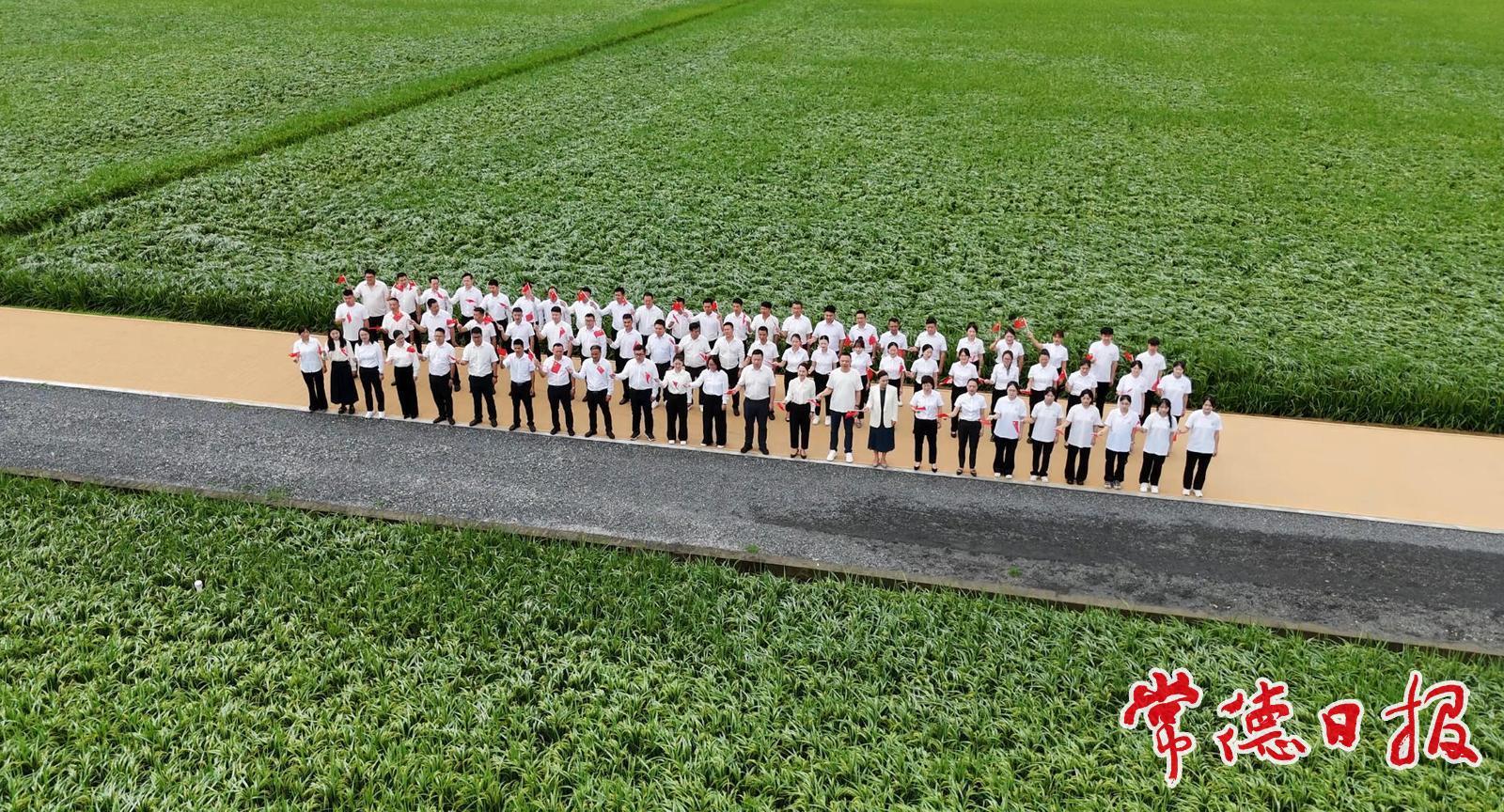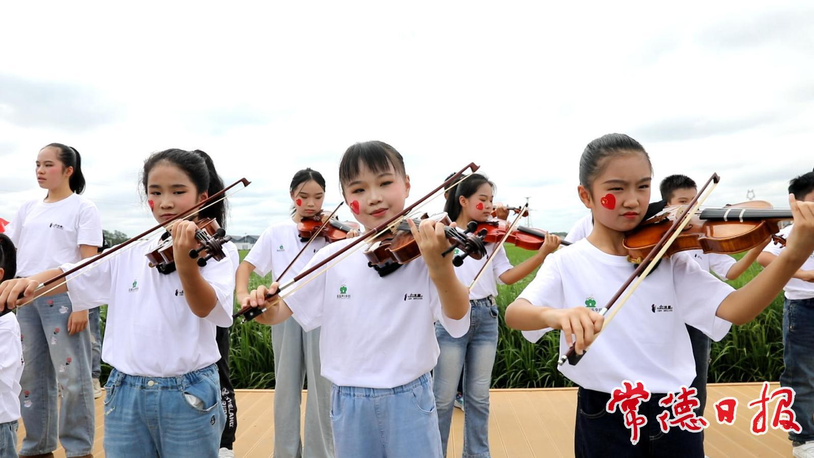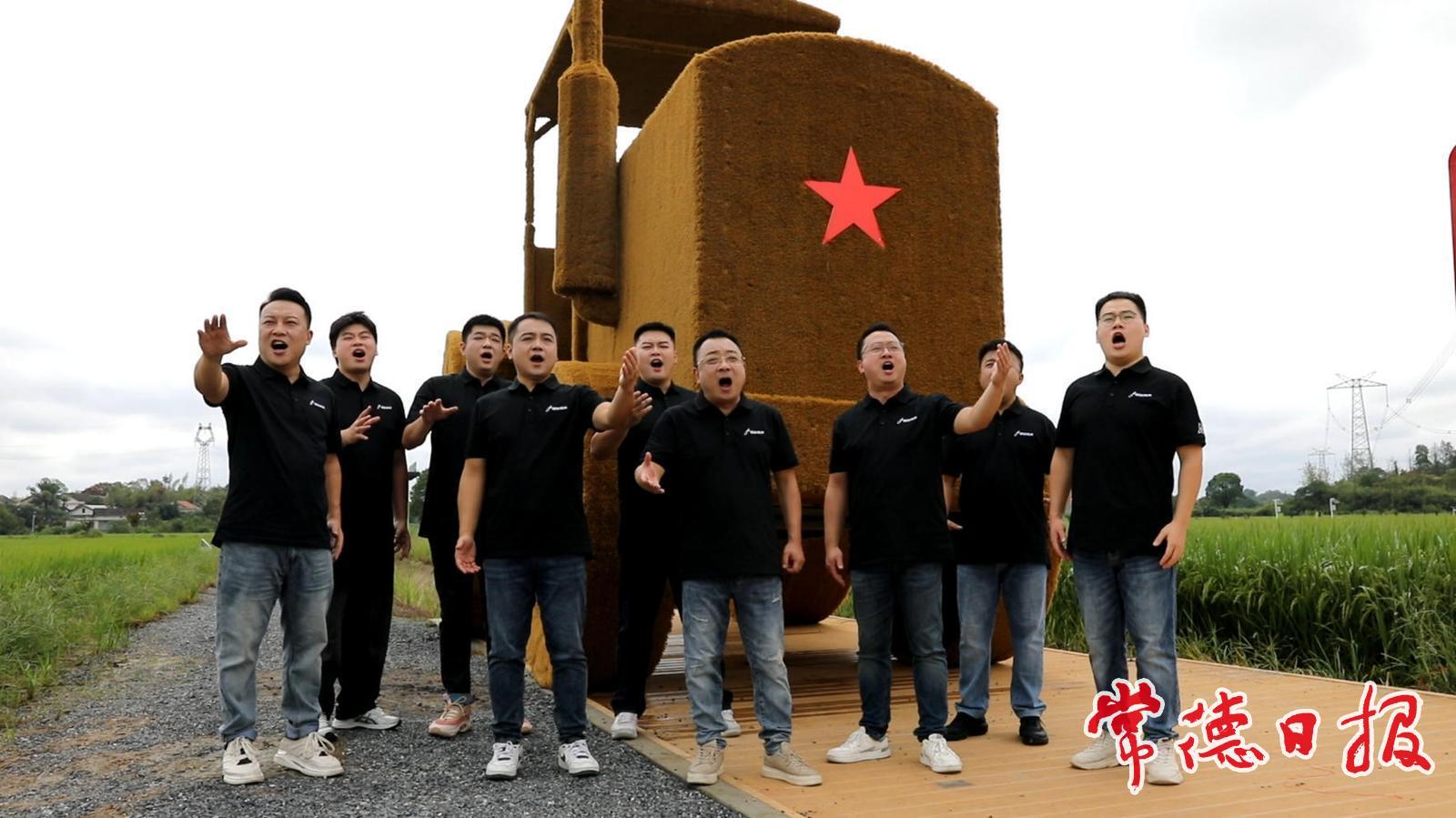 歌聲在稻田上空飄揚,鼎城區相關領導、港中實業集團干部職工、謝家鋪鎮干部職工代表手持國旗,從不同方位匯聚而來。新農人與鄉村講解員代表在田埂上放聲歌唱,湖南應用職業技術學院學子揮舞著手中的旗幟,常德蟋蟀男聲合唱團、啟明星弦樂團與武陵合唱團的演出相得益彰。隨后,蟋蟀男聲合唱團帶來的《紅星閃閃》引發全場共鳴,揮舞的國旗與燦爛的笑容交織,現場氣氛溫暖而熱烈。