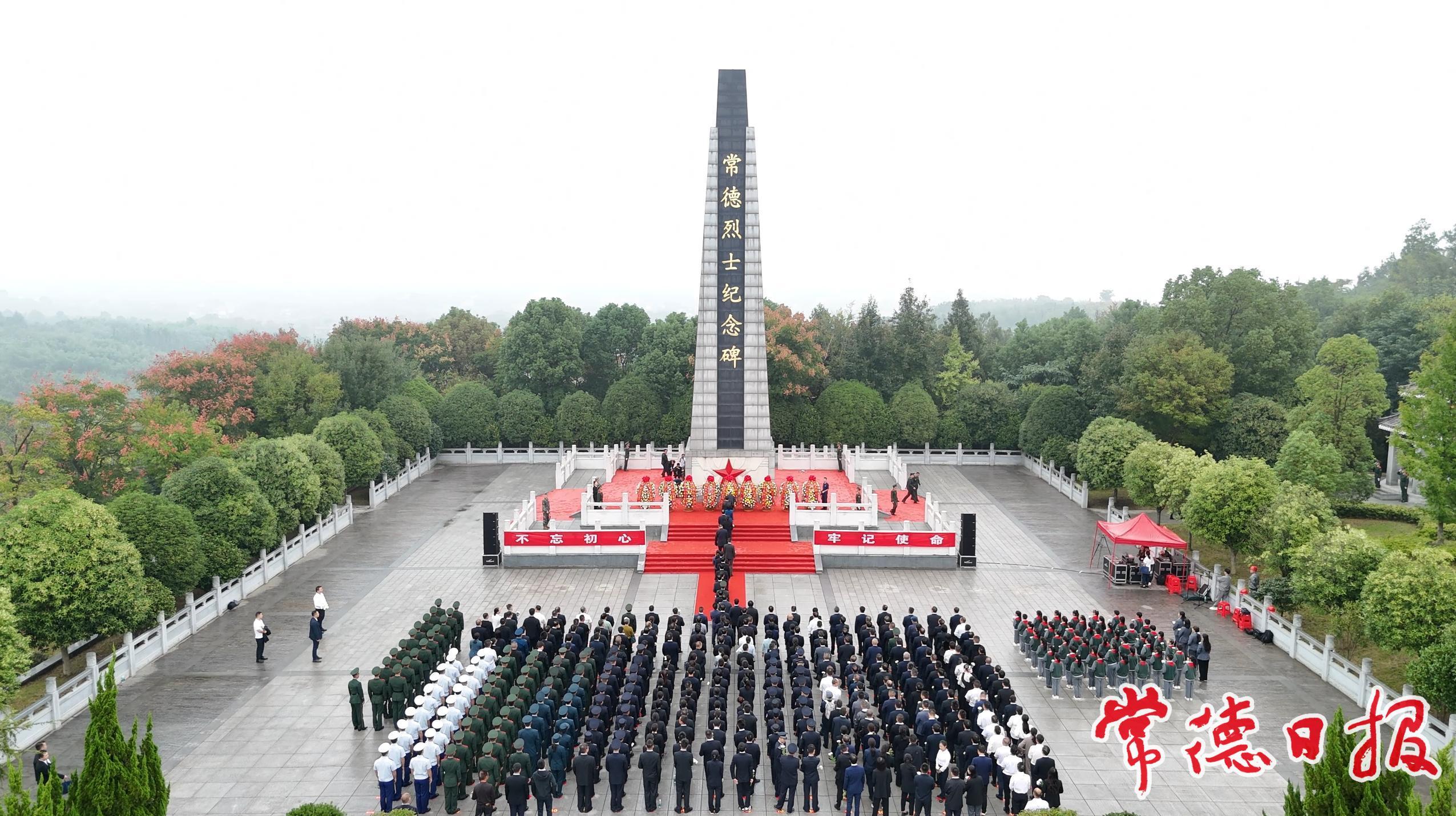 在深情的《獻花曲》中,禮兵將中共常德市委,市人大常委會,市政府,市政協,常德軍分區,各民主黨派常德市委會、市工商聯和無黨派愛國人士、各人民團體,常德市社會各界群眾,老戰士、老同志和烈士親屬,全市少先隊員敬獻的9個花籃托起,緩步拾級而上,在烈士紀念碑前排開。