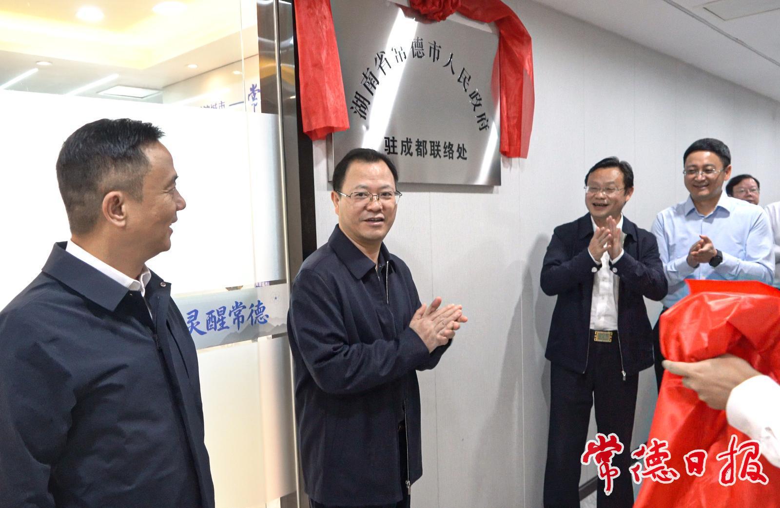 常德日報記者 陳歡 文/圖 10月13日,常德市人民政府駐成都聯絡處揭牌儀式在成都舉行。市委副書記、市長周振宇,市委常委、市委組織部部長向秀亮出席儀式并為聯絡處揭牌。