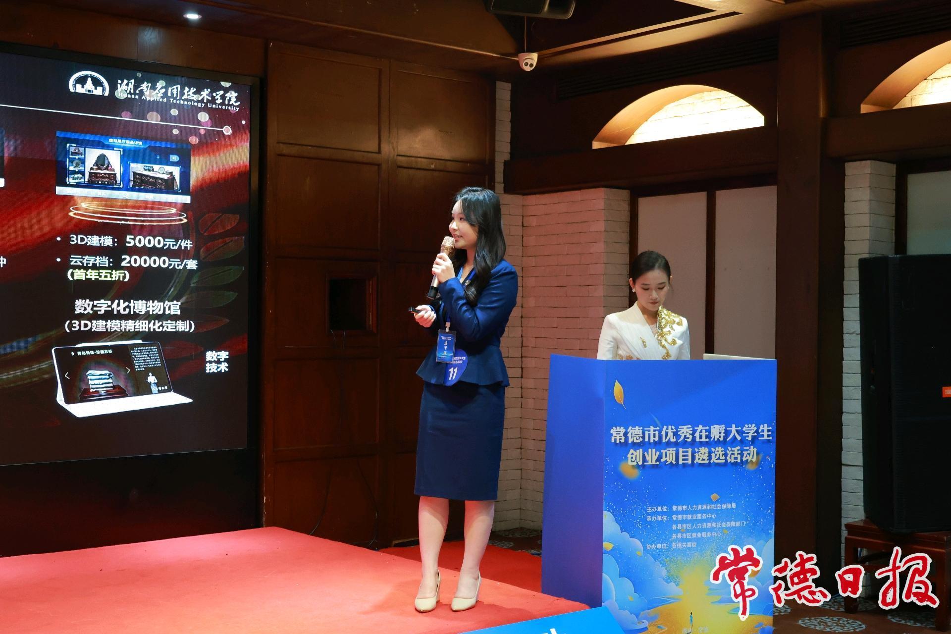 常德日?qǐng)?bào)記者 姚懿容 通訊員 周峰 馮俊杰 文/圖 11月25日,常德市優(yōu)秀在孵大學(xué)生創(chuàng)業(yè)項(xiàng)目遴選活動(dòng)在澤云酒店舉行。15個(gè)大學(xué)生創(chuàng)業(yè)項(xiàng)目團(tuán)隊(duì)同臺(tái)競(jìng)技,經(jīng)過(guò)項(xiàng)目路演、評(píng)委提問(wèn)及現(xiàn)場(chǎng)評(píng)分等環(huán)節(jié),10個(gè)優(yōu)秀項(xiàng)目脫穎而出。