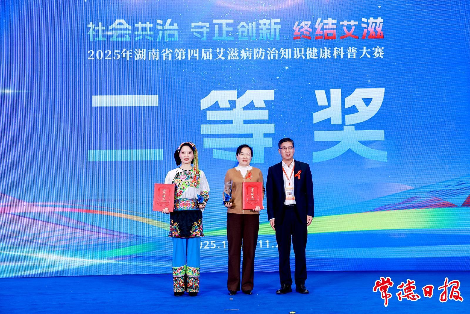 常德日報記者 李白 通訊員 鄭偉峰 文/圖 11月28日,2025年湖南省世界艾滋病日主題宣傳活動暨第四屆艾滋病健康科普大賽總決賽在長沙舉行。經過14個市州激烈的角逐,由常德市疾控局選送、常德市疾控中心創作的音樂科普情景劇《光的方向》獲得本次大賽二等獎。