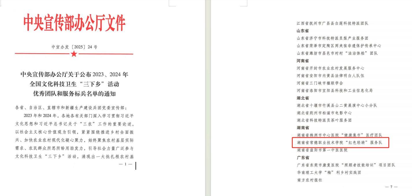 常德日報記者 李龍 通訊員 劉燁 何瓊 文/圖 近日,中央宣傳部辦公廳印發(fā)《關(guān)于公布2023、2024年全國文化科技衛(wèi)生“三下鄉(xiāng)”活動優(yōu)秀團(tuán)隊和服務(wù)標(biāo)兵名單的通知》,常德職業(yè)技術(shù)學(xué)院“紅色輕騎”服務(wù)隊榮獲2023年全國文化科技衛(wèi)生“三下鄉(xiāng)”活動優(yōu)秀團(tuán)隊稱號。