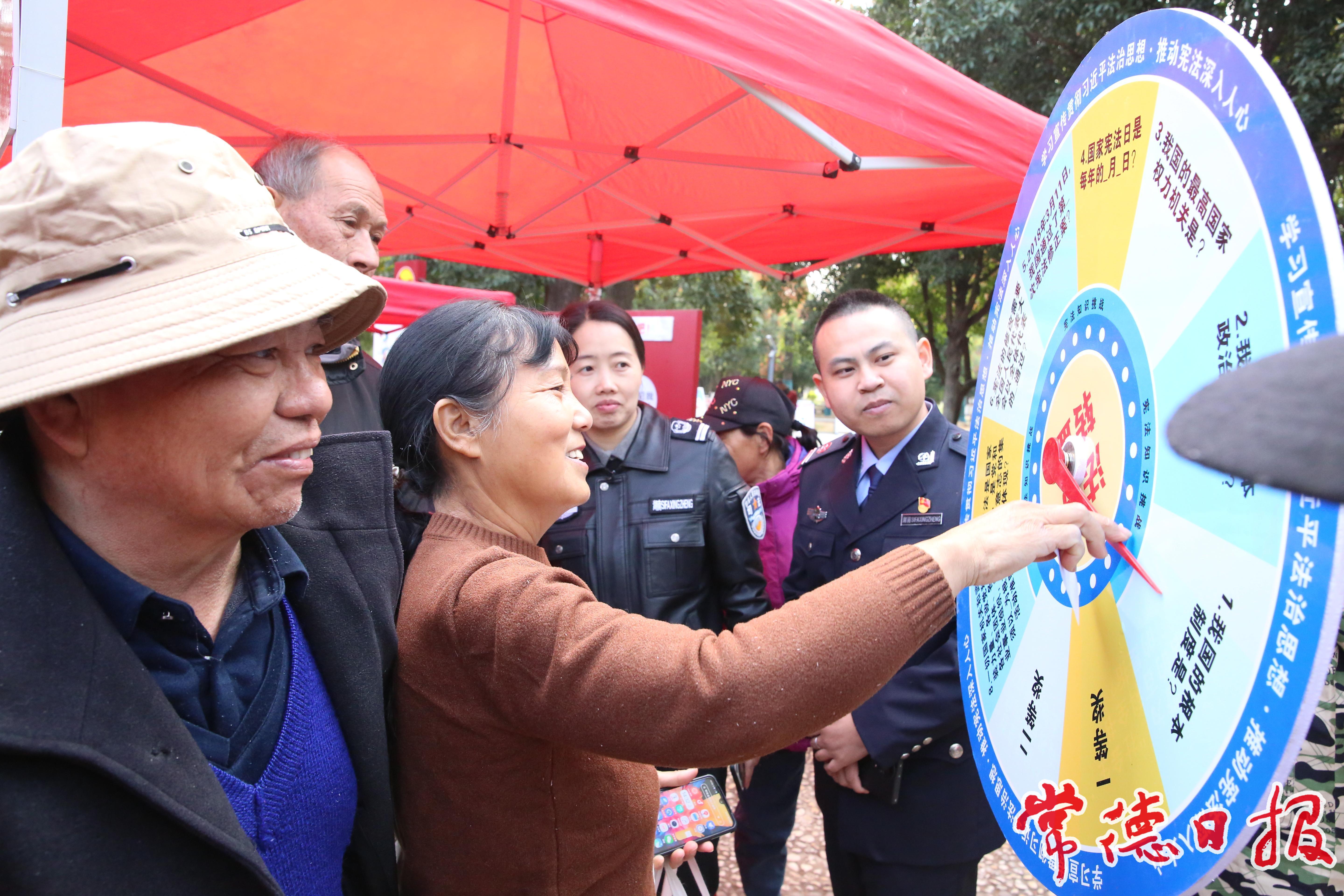 活動現場還精心設置了豐富多彩的互動環節。在憲法知識有獎問答環節,主持人圍繞習近平法治思想、憲法、法治宣傳教育法及民法典等內容提問,現場群眾踴躍舉手、積極搶答,氣氛熱烈?;顒油皆O置了“打卡發圈領好禮”和“幸運轉盤贏升級禮”互動區,居民們紛紛在主題打卡墻前合影留念,并通過社交媒體分享活動現場,傳遞學法熱情。完成打卡的居民還可參與幸運轉盤抽獎,寓教于樂,極大提升了活動的趣味性和參與度。