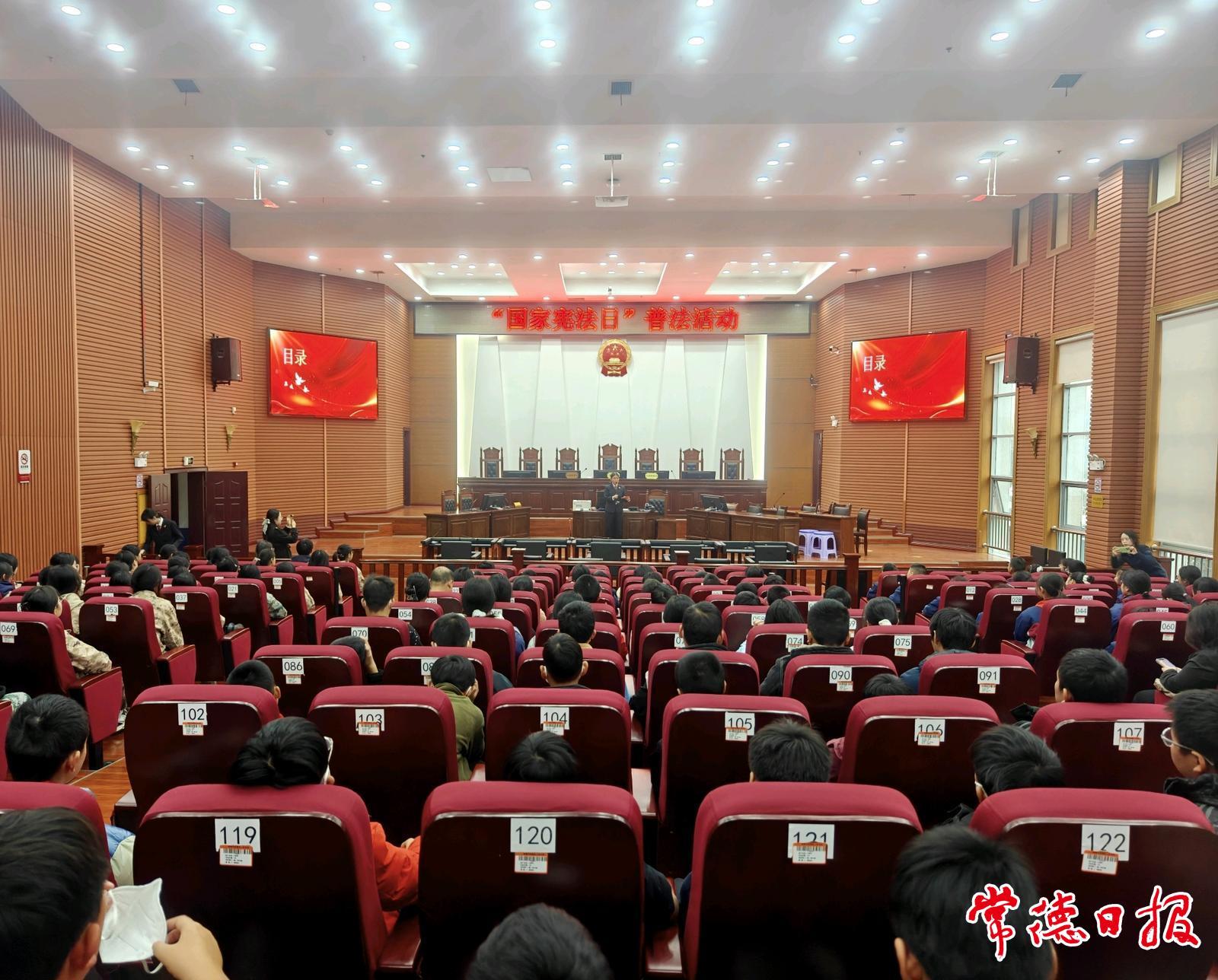 常德日報記者 江一舟 姚璇 文/圖 12月4日是國家憲法日,常德市二中、常德市十七中及武陵區旭輝東升小學的170余名師生走進武陵區人民法院第一審判庭,旁聽刑事案件庭審、參與普法互動,上了堂別開生面的“沉浸式”憲法宣傳課。
