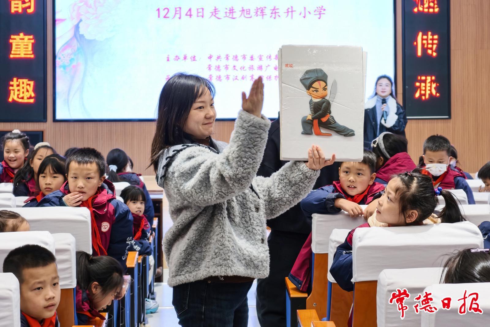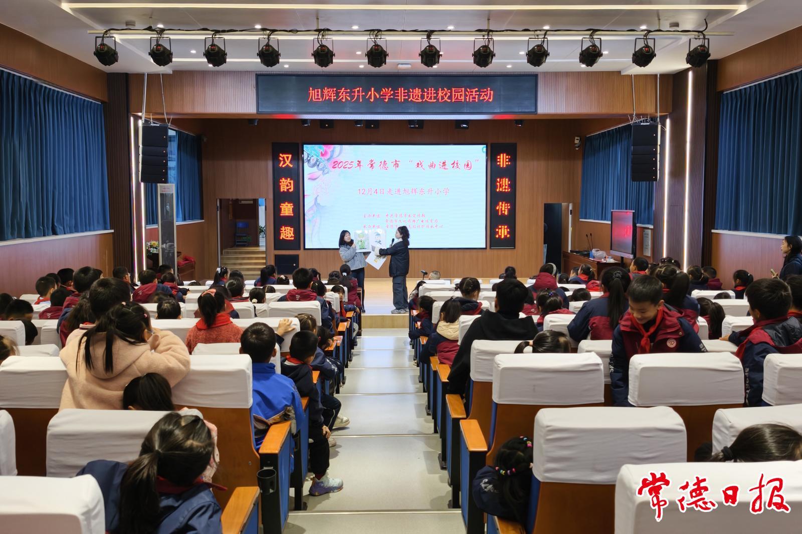 常德日報記者 裴維維 通訊員 葉丹 李莉 文/圖 12月5日,一場別開生面的非遺盛宴在武陵區旭輝東升小學拉開帷幕。常德市漢劇高腔保護傳承中心的演員們走進校園,為200余名小學生帶來了沉浸式的漢劇文化體驗,讓孩子們近距離觸摸非遺瑰寶,感受傳統戲曲的獨特魅力。