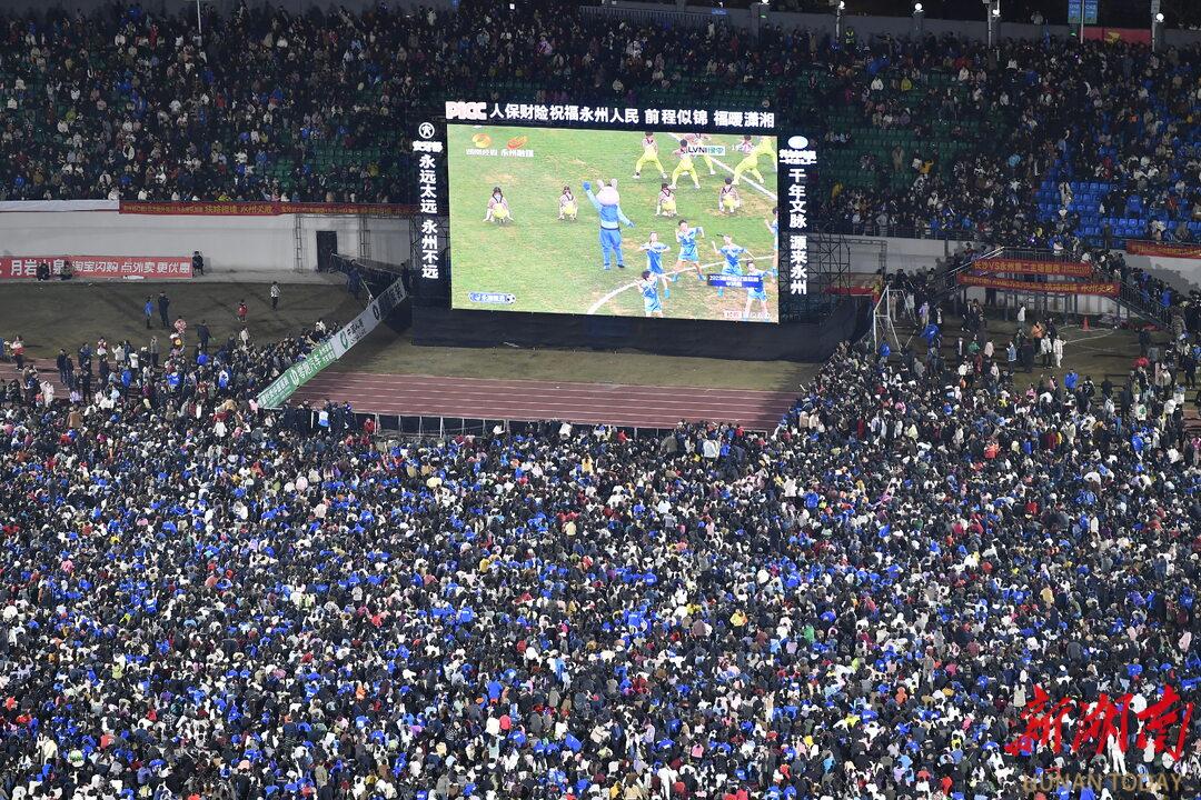 12月20日晚,永州市體育場,數萬市民齊聚永州市體育場,為遠征客場的家鄉球隊加油助威,“第二主場”匯成藍色海洋。湖南日報全媒體記者 童迪 攝