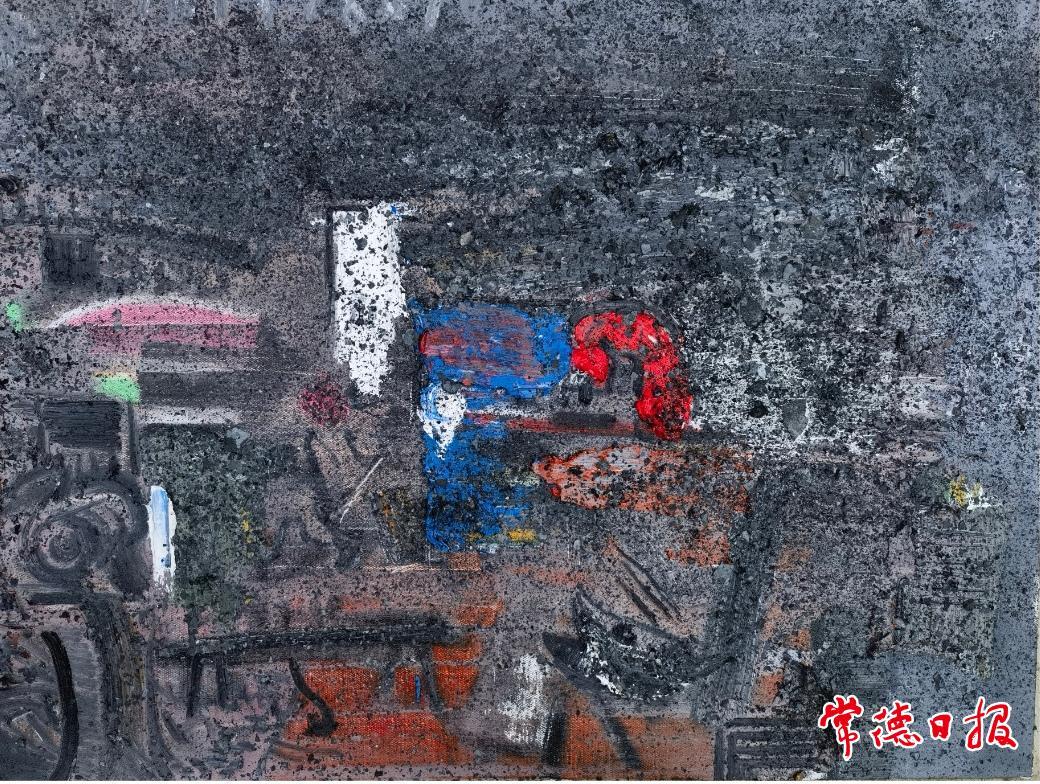 劉漢軍的油畫作品《八字哨老字號(hào)·胡記鐵鋪印象》以當(dāng)?shù)乩献痔?hào)鐵匠鋪及匠人為創(chuàng)作原型,生動(dòng)刻畫了傳統(tǒng)手工藝場景,詮釋了精益求精的工匠精神與民間藝術(shù)的生機(jī)延續(xù)。他的另一幅書法作品《三湘四水》,則結(jié)合了地域文化內(nèi)涵自撰文創(chuàng)作完成,藝術(shù)地展現(xiàn)了湖南獨(dú)特的自然人文景觀。