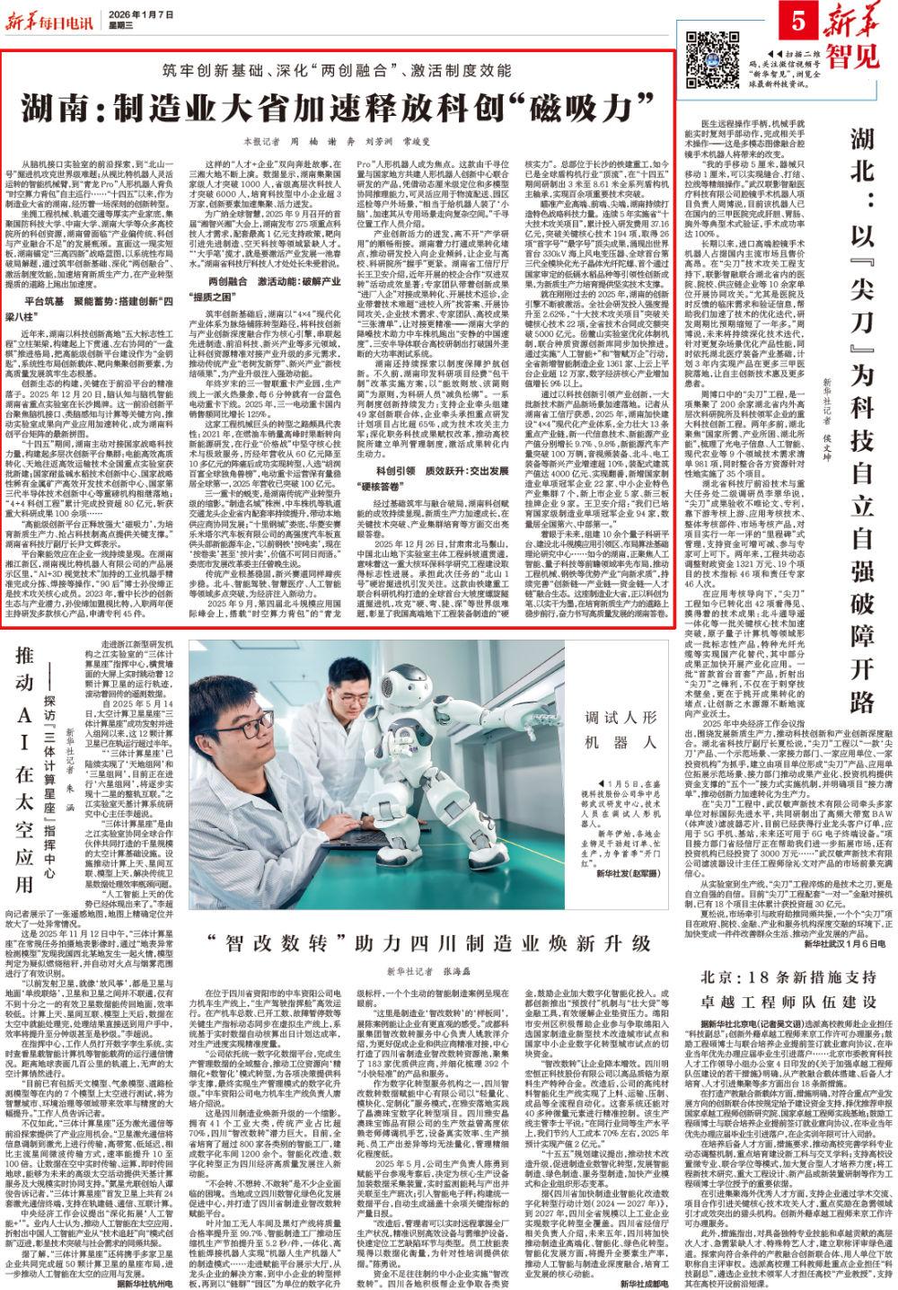 著眼于未來(lái),組建10余個(gè)量子科研平臺(tái)、建設(shè)北斗規(guī)模應(yīng)用引領(lǐng)區(qū)、布局算法基礎(chǔ)理論研究中心……如今的湖南,正聚焦人工智能、量子科技等前瞻領(lǐng)域率先布局,推動(dòng)工程機(jī)械、鋼鐵等優(yōu)勢(shì)產(chǎn)業(yè)“向新求質(zhì)”,持續(xù)完善“創(chuàng)新鏈—產(chǎn)業(yè)鏈—資金鏈—人才鏈”融合生態(tài)。這座制造業(yè)大省,正以科創(chuàng)為筆、以實(shí)干為墨,在培育新質(zhì)生產(chǎn)力的道路上穩(wěn)步前行,奮力書寫高質(zhì)量發(fā)展的湖南答卷。